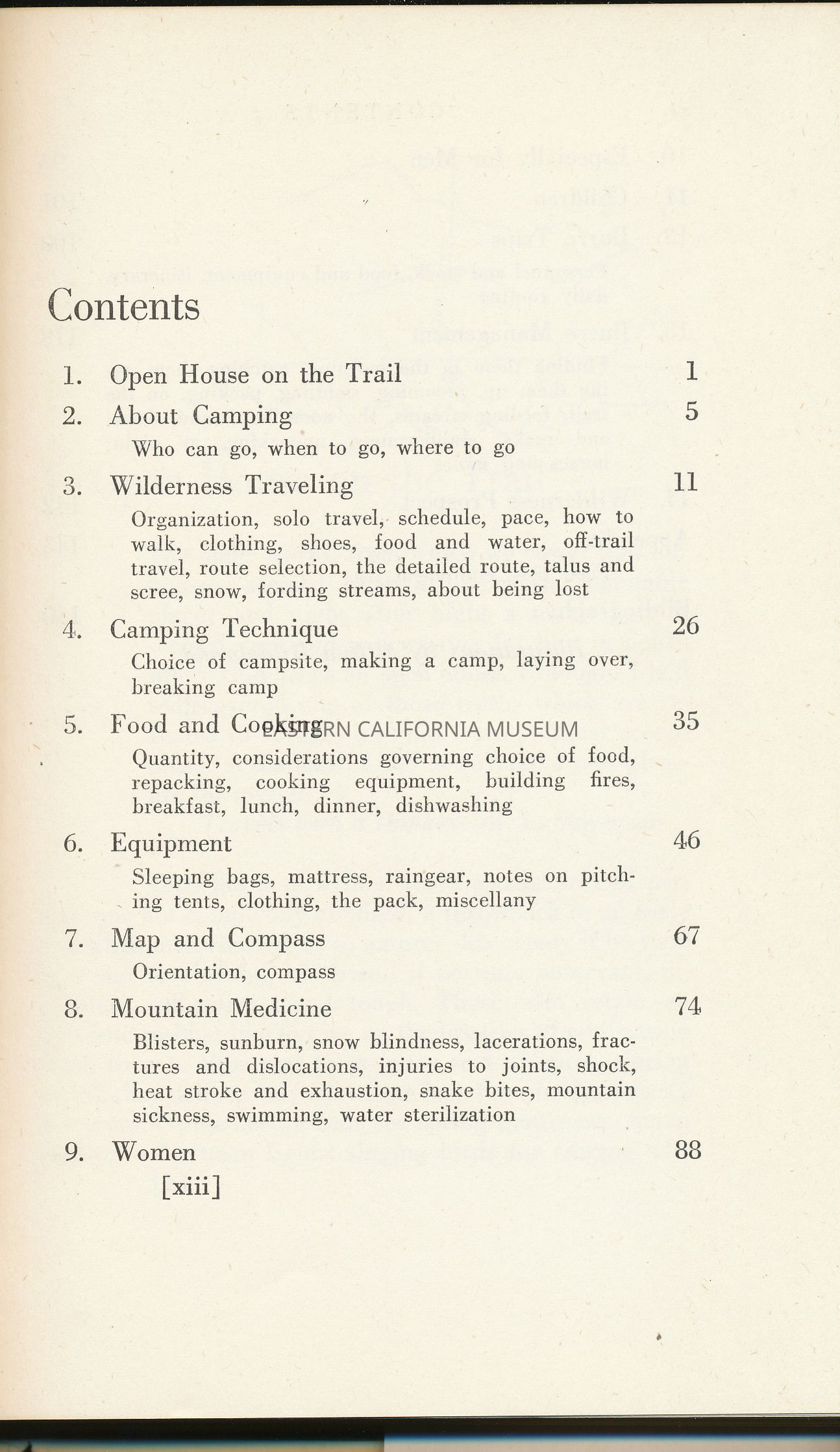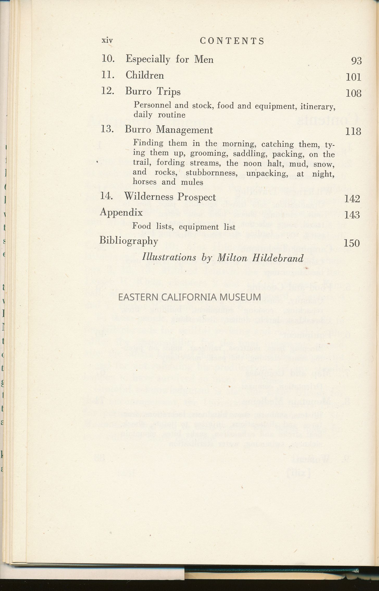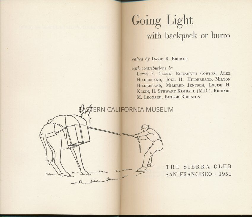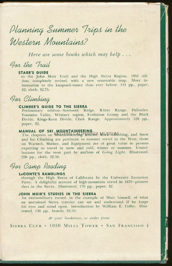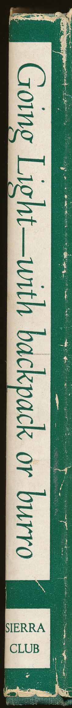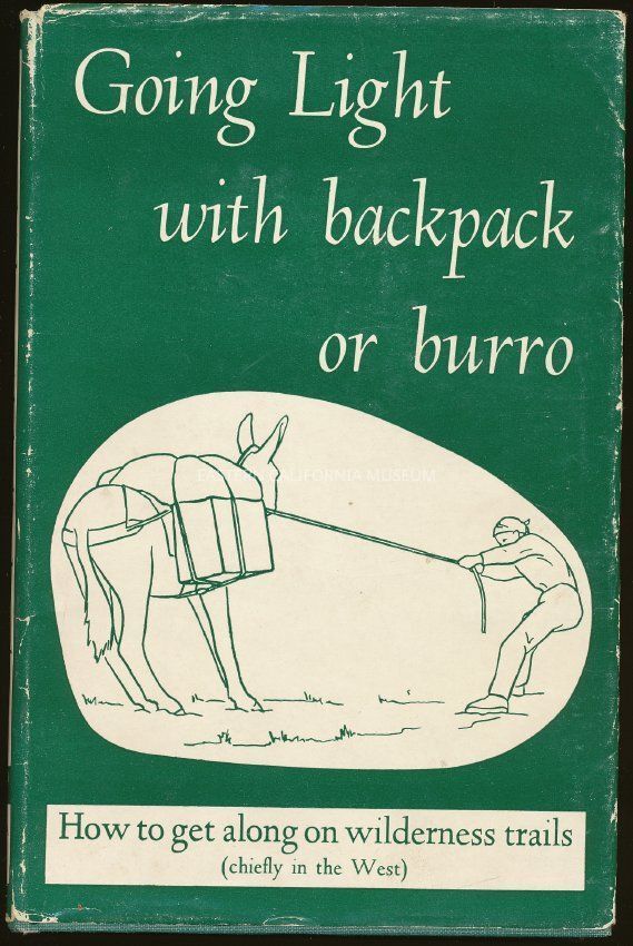 This is a backpacking manual that includes what and why to take on trails, camping, food, equipment, maps, medicine plus burros and burro management. There are appealing illustrations of the wilderness and specific information and instructions regarding the wilderness. Dustjacket is forest green with the title in white letters near top. A free form circle in lower half of page has an image of a fully packed burro facing a person who is pulling on a rope attached to the burro. At the very bottom in green letter with white background is "How to get along on wilderness trails (chiefly in the West)".
