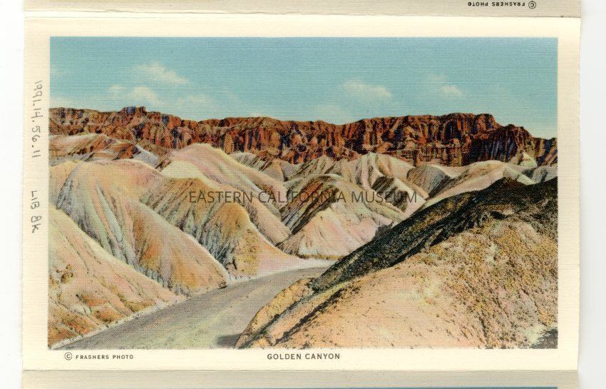Color print of a dirt road going through a mountain landscape in Death Valley. It is labeled, "Golden Canyon." It is on textured paper.
