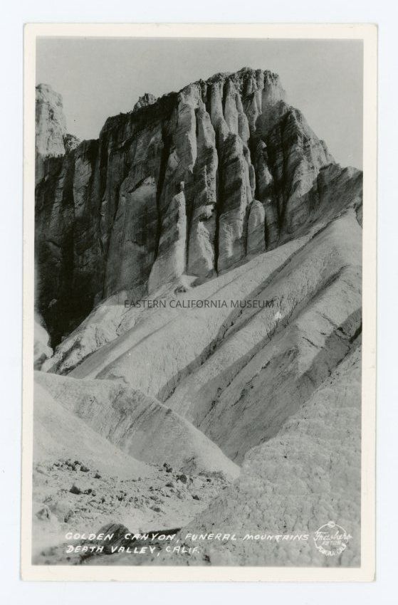 Photo postcard of a mountain peak in Death Valley. It is labeled, "Golden Canyon, Funeral Mountains, Death Valley, Calif."Collection