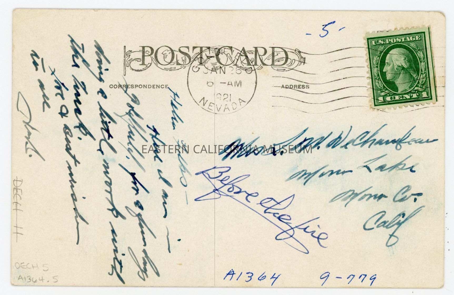Photo postcard titled, "Goldfield, Nevada." It was sent to Mrs. L. W. DeChambeau at Mono Lake from Goldfield on January 26, 1921, from Herb (the donor to his mother). It has a green one cent George Washington stamp.