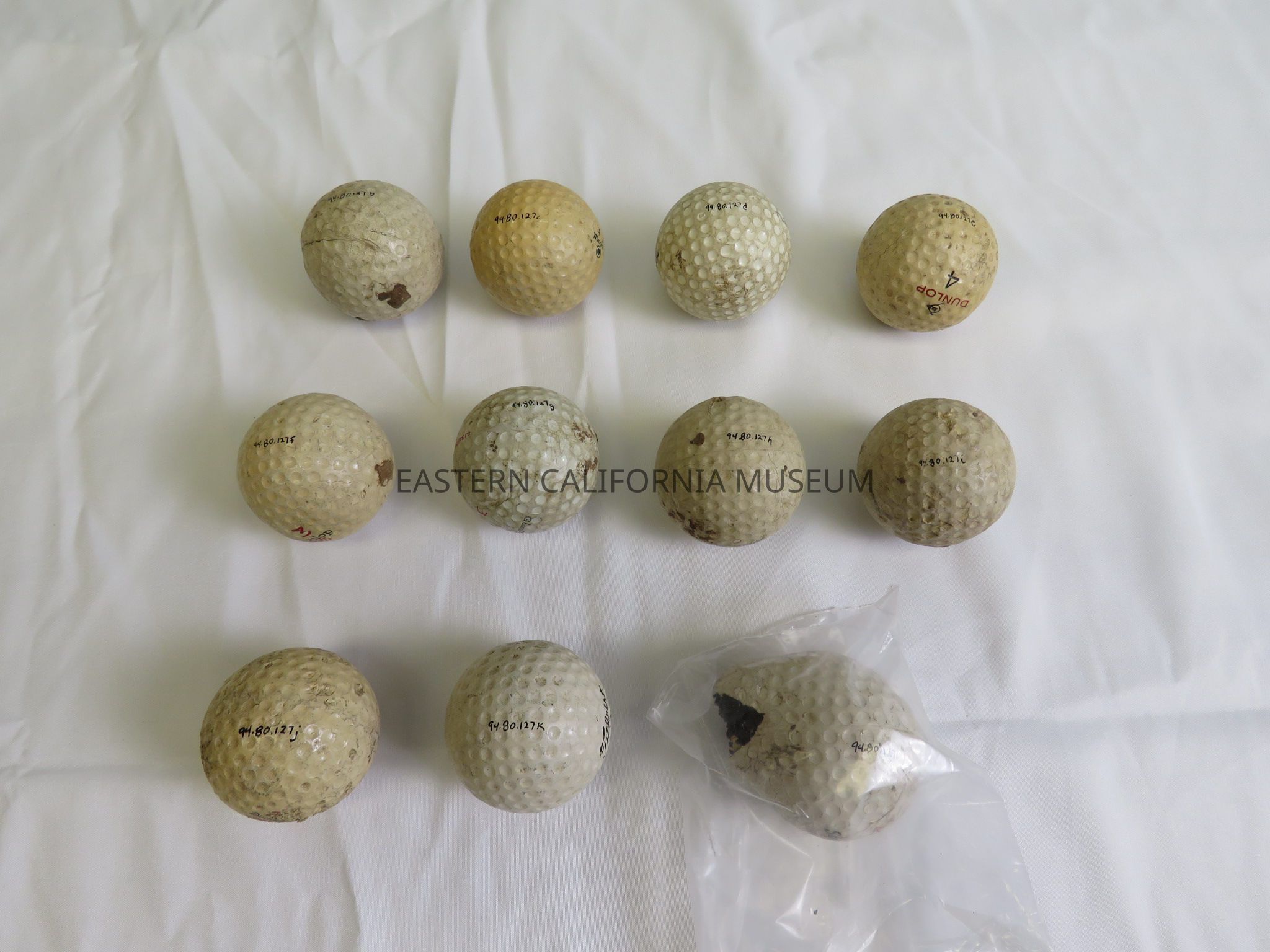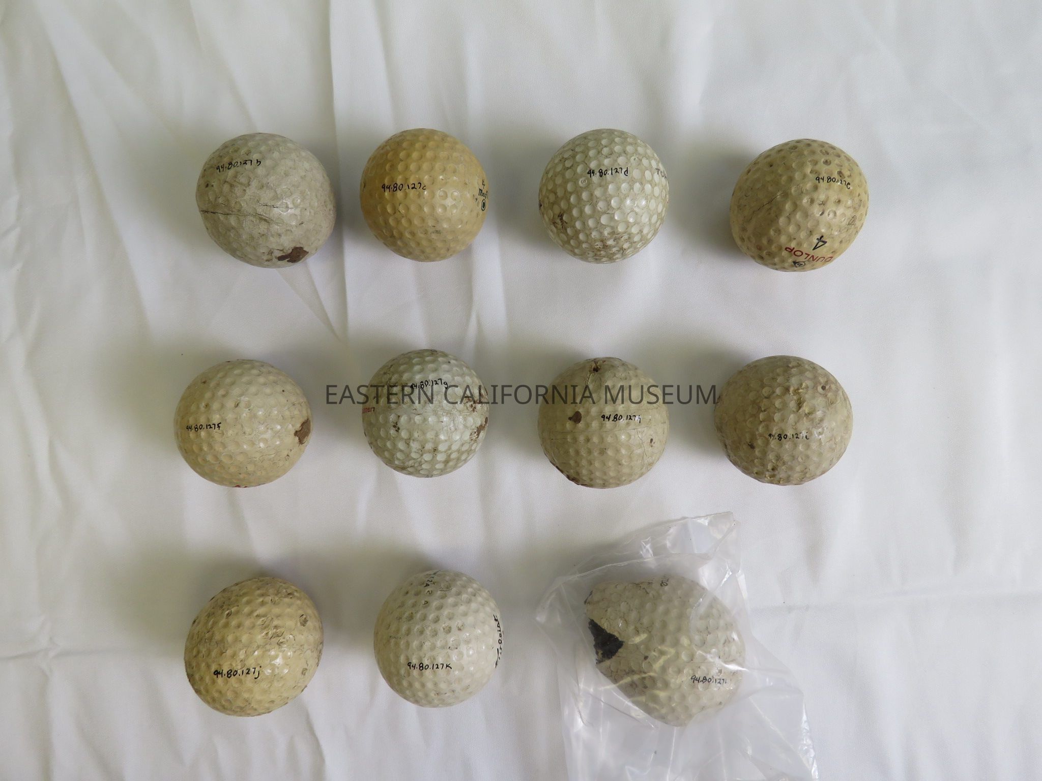 Golf balls used at Manzanar War Relocation Center. 1994.80.127l has burst/split open.
