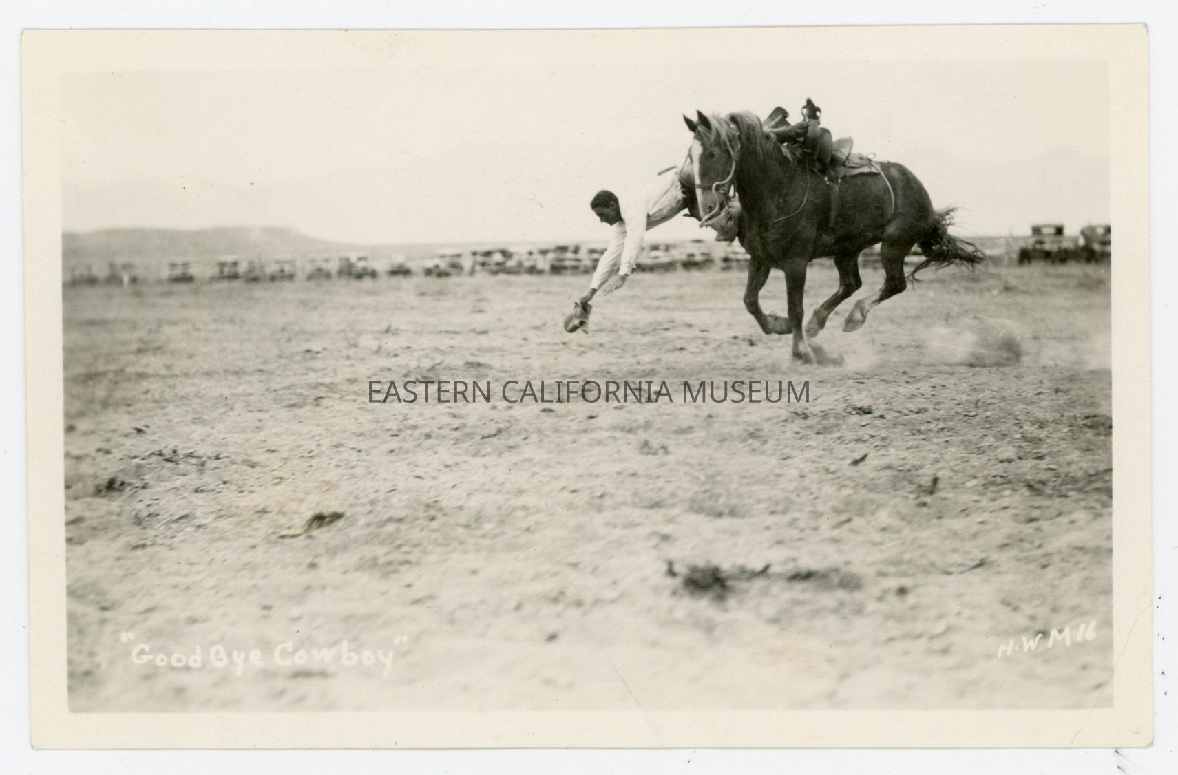 Photo titled, "Goodbye Cowboy" taken by photographer Harry W. Mendenhall and given his ID #16. It shows a a man falling off a horse during a rodeo. There is a long row of vehicles in the background.