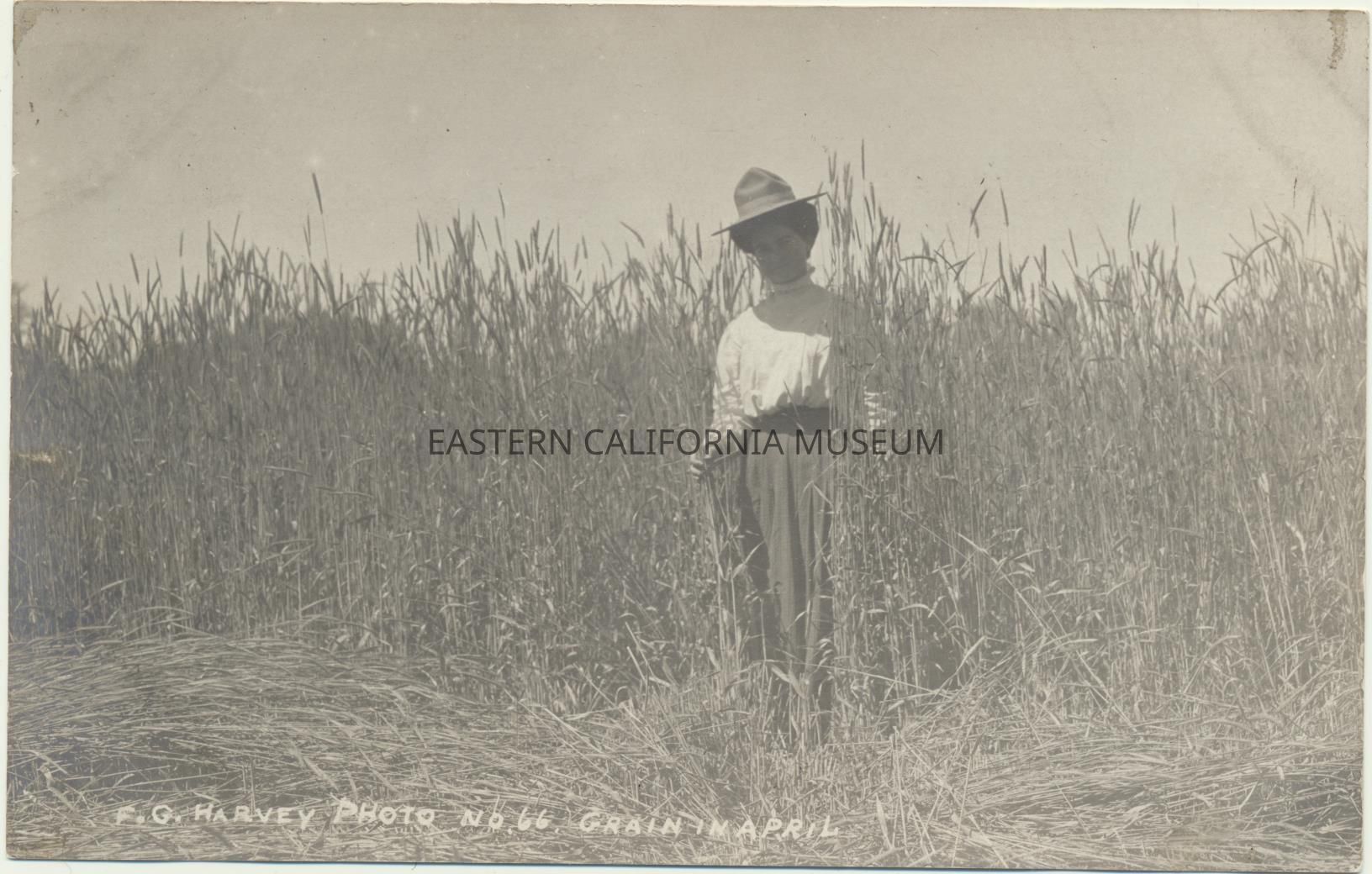 Photo postcard titled, "Grain in April" taken by photographer F. G. Harvey and given his ID #66. A handwritten note in the accession book identifies her as Fred Harvey's wife, Julia J. Harvey. The location may be the Harvey Ranch.Collection