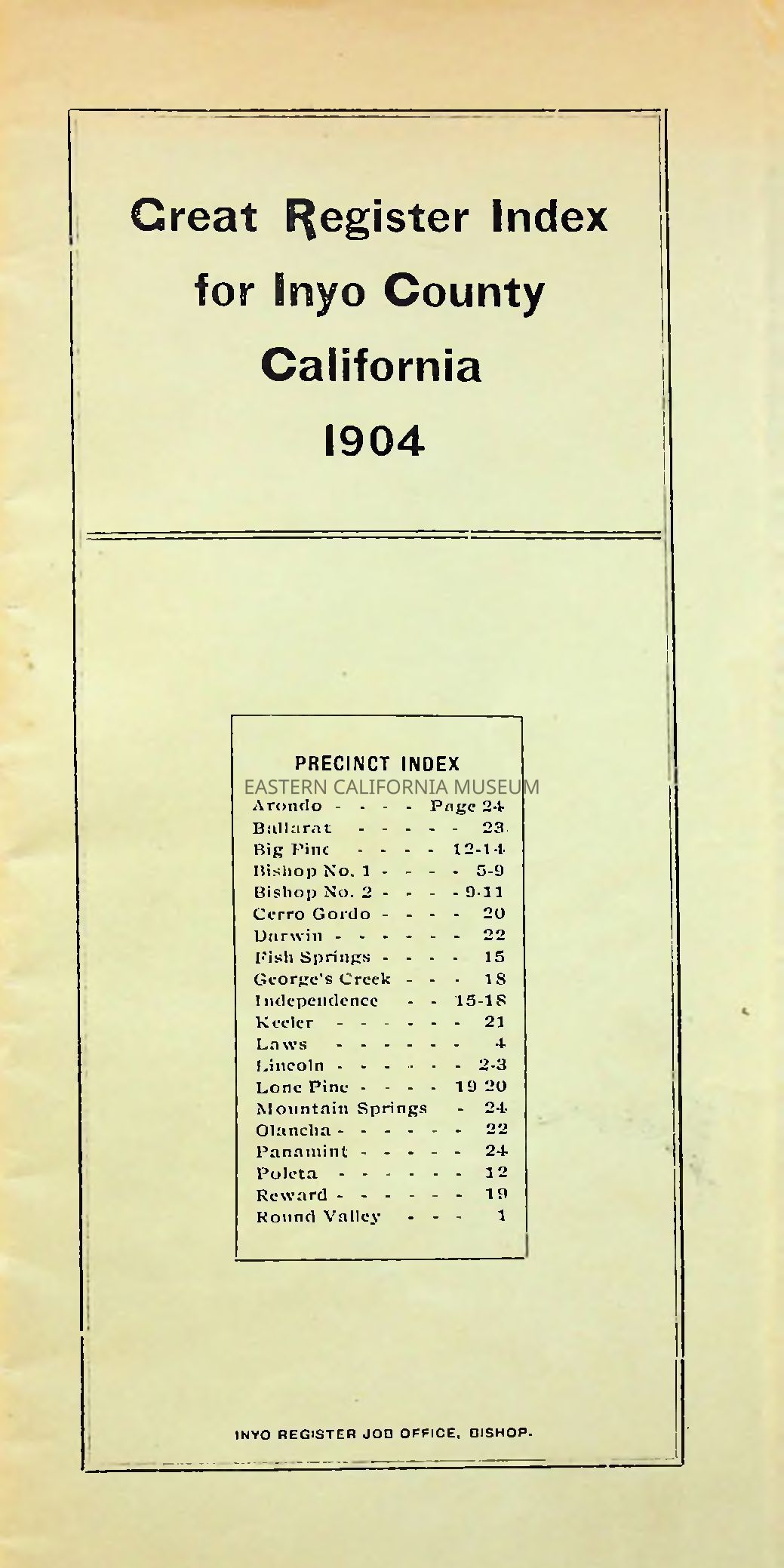 Great Register Index for Inyo County, California, 1904.Collection