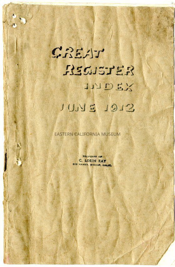 (Anonymous) (June 1912) The Great Register Index for 1912, previously owned by C. Lorin Ray and the the Inyo Register. Contains lists of precincts, names, sex, occupations, addresses, and political affiliations of residents. (34 pages)Collection