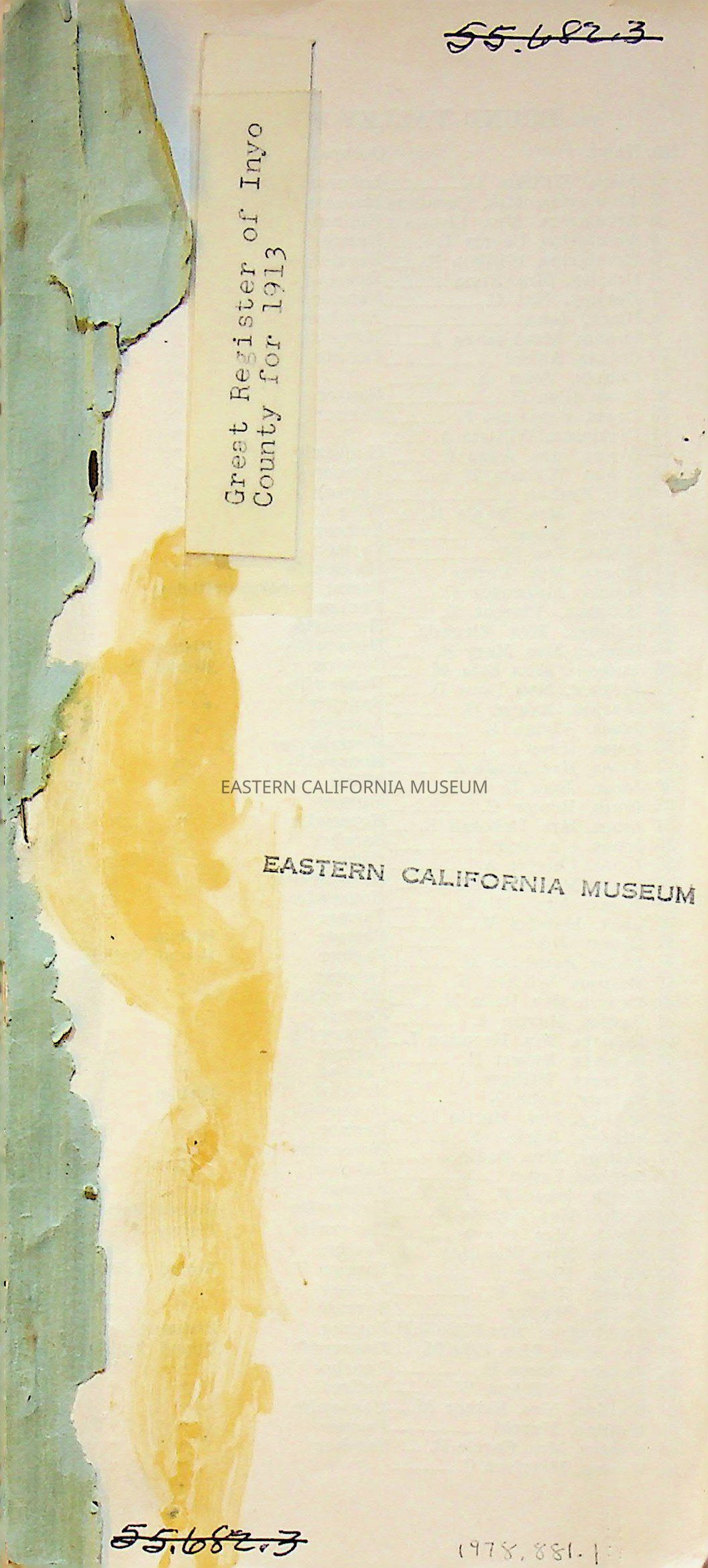 Great Register, Inyo County, 1913. Missing cover, only has an old label taped on to identify it.