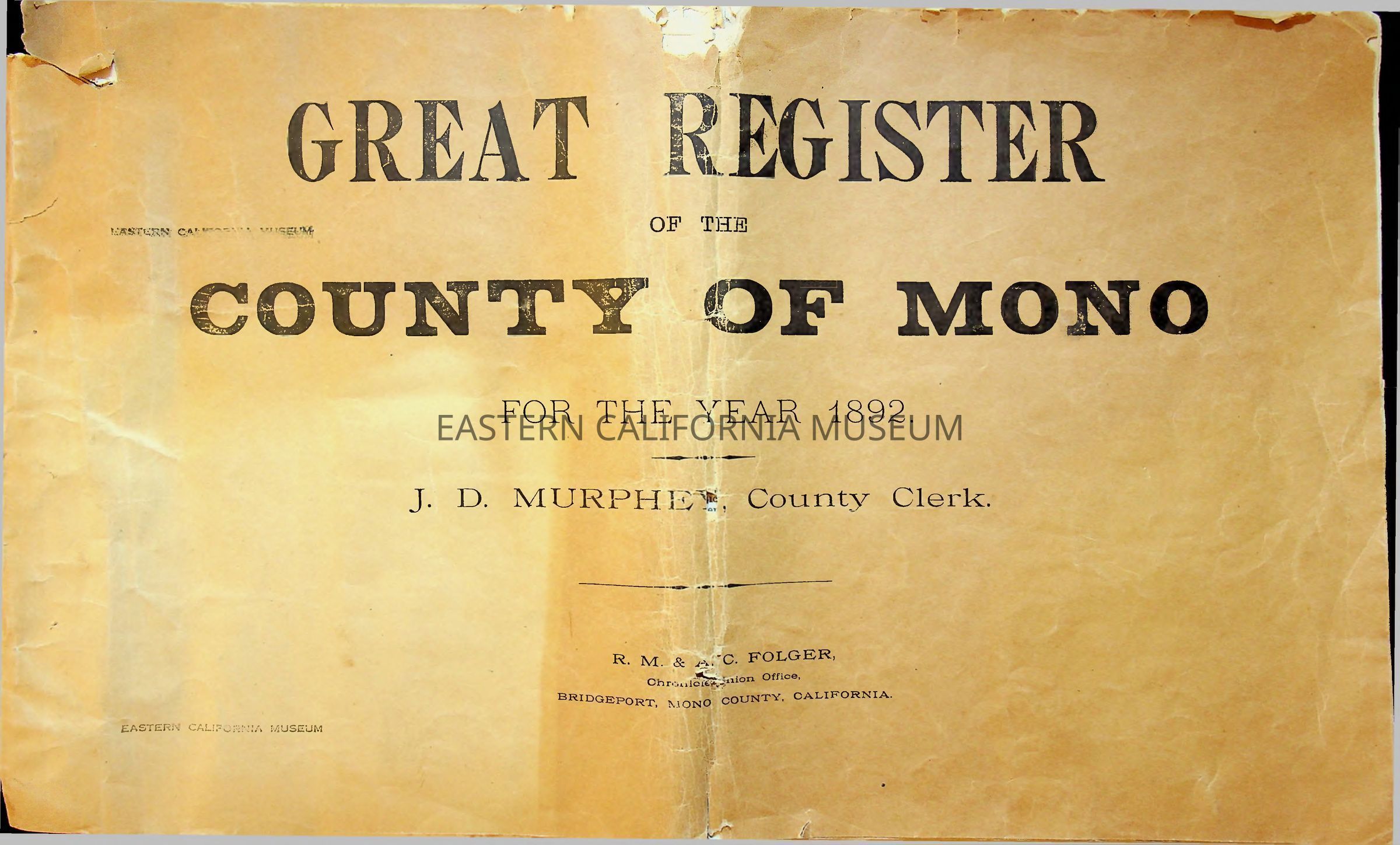 Great Register of the County of Mono for the Year 1892. J. D. Murphey, County Clerk.