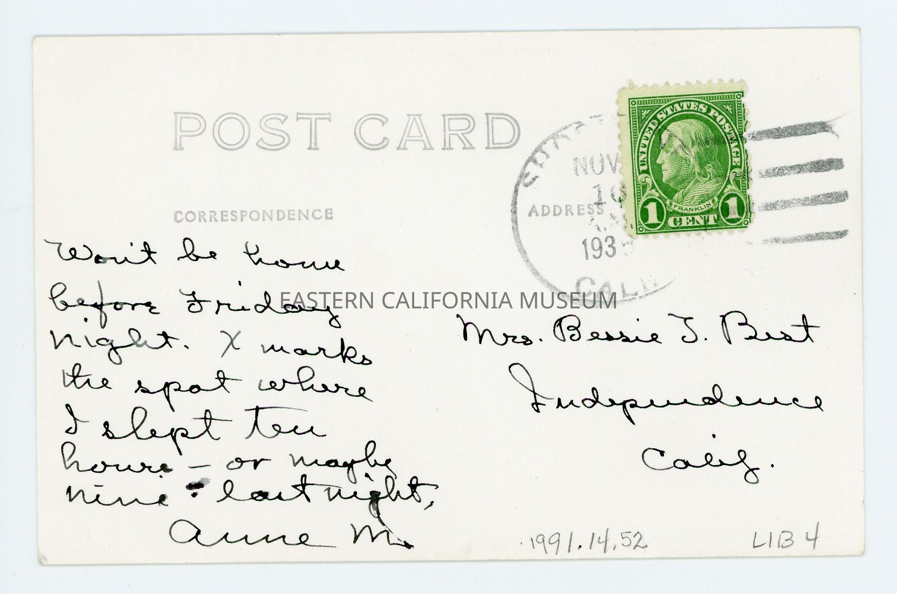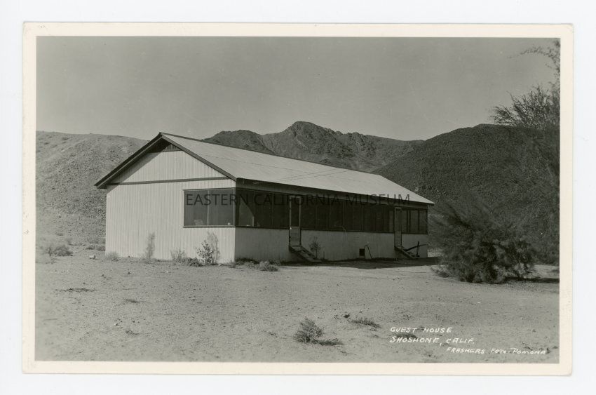 Photo postcard of a lone building in a desert. It is labeled, "Guest House, Shoshone, Calif." It was written by Anne M. [maybe Margrave, the County Librarian?] to Bessie T. Best of Independence. It says, "Won't be home before Friday night. X marks the spot where I slept ten hours--or maybe nine--last night." It has a green one cent Benjamin Franklin stamp and a cancellation stamp from Shoshone dated November 10, 193?.Collection