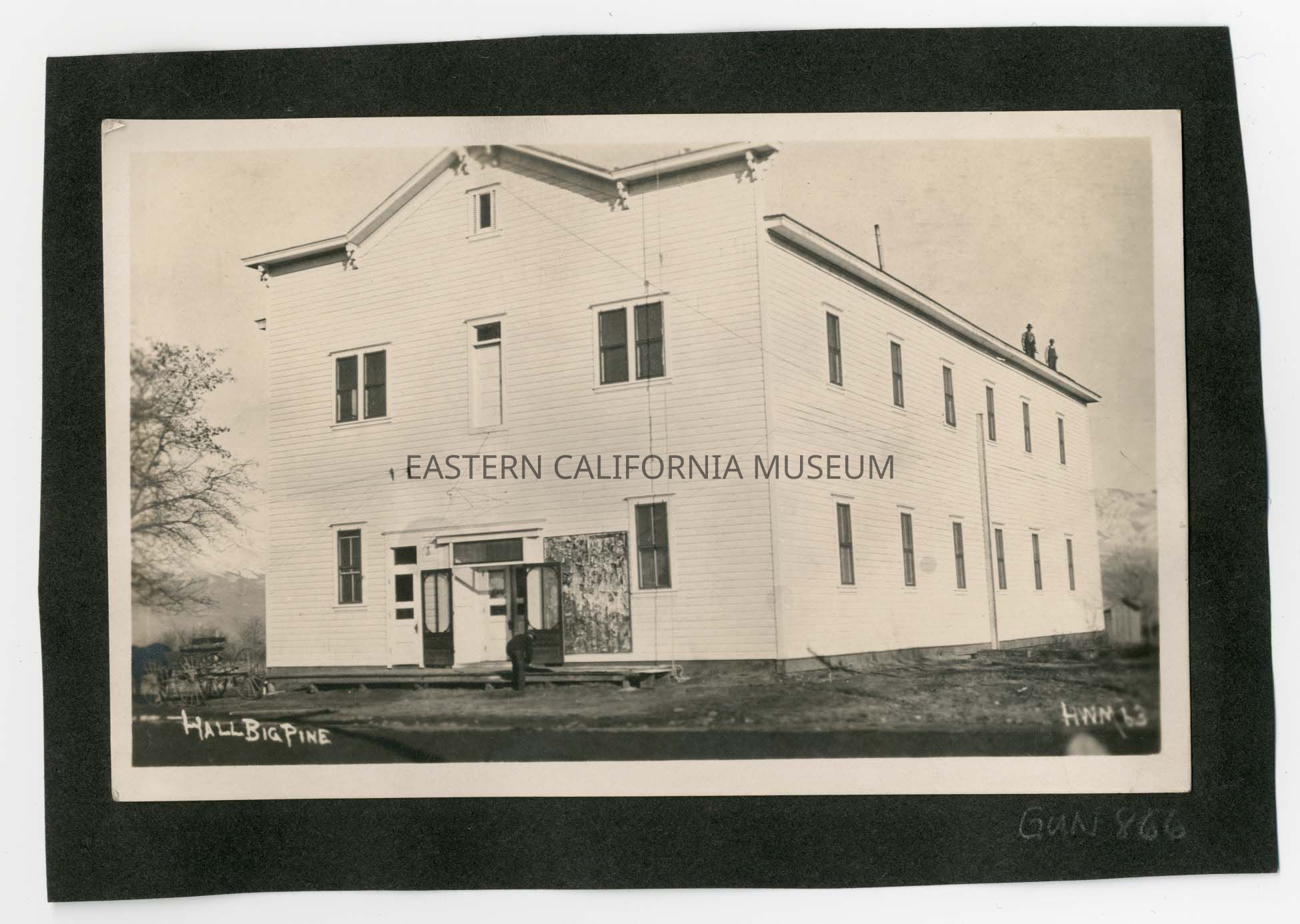 Photo of two men standing on the roof of a two story white building. It is titled, "Hall, Big Pine" and was taken by H. W. Mendenhall and given his ID #63. The building was built by George Hall and functioned as Big Pine's community center/dance hall/etc. The roof collapsed after a heavy snow storm.