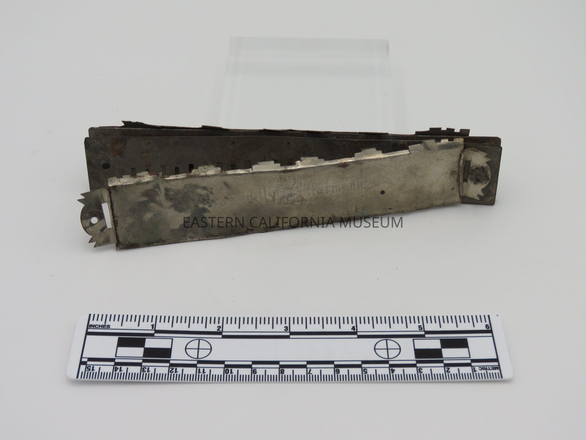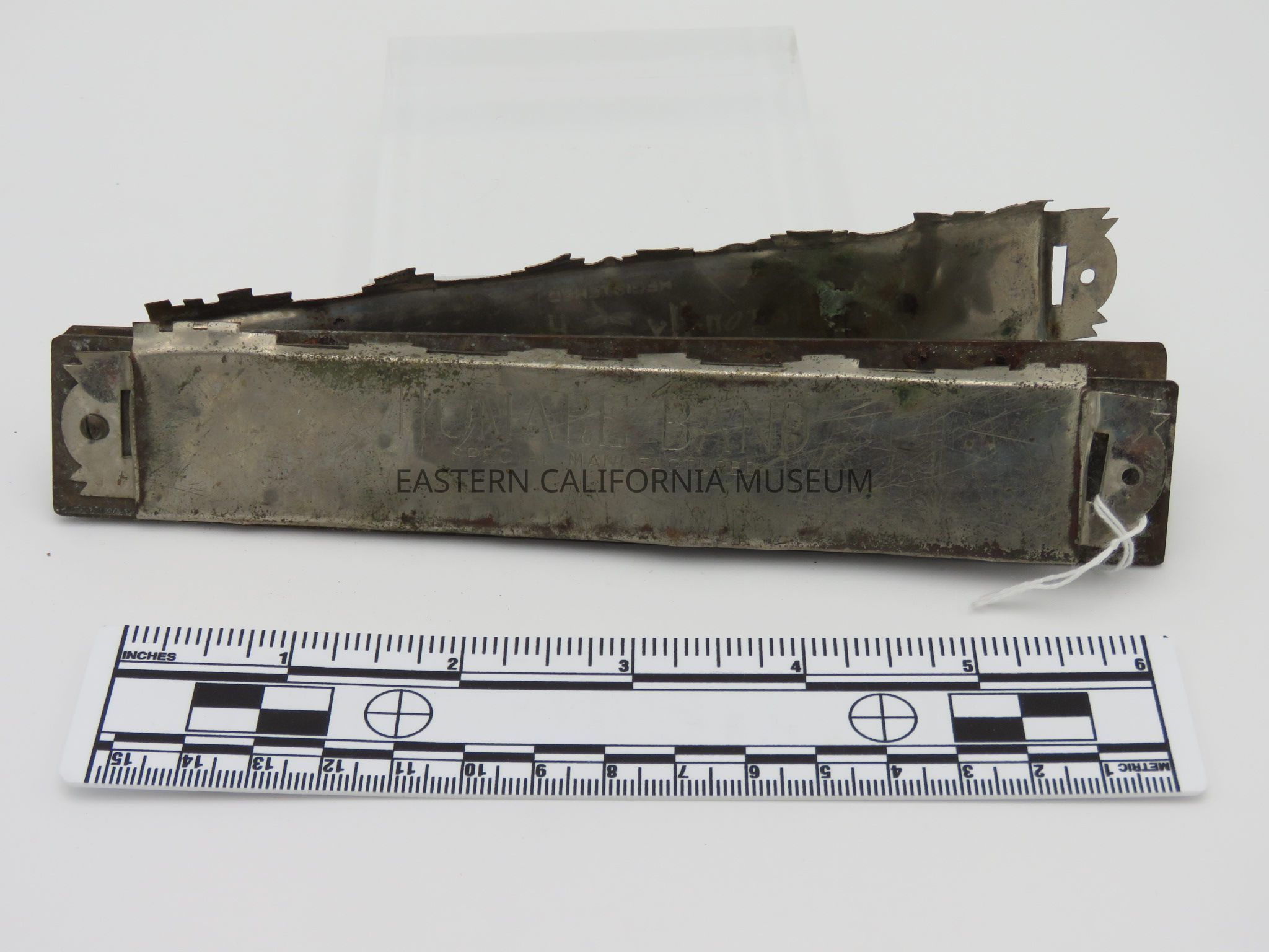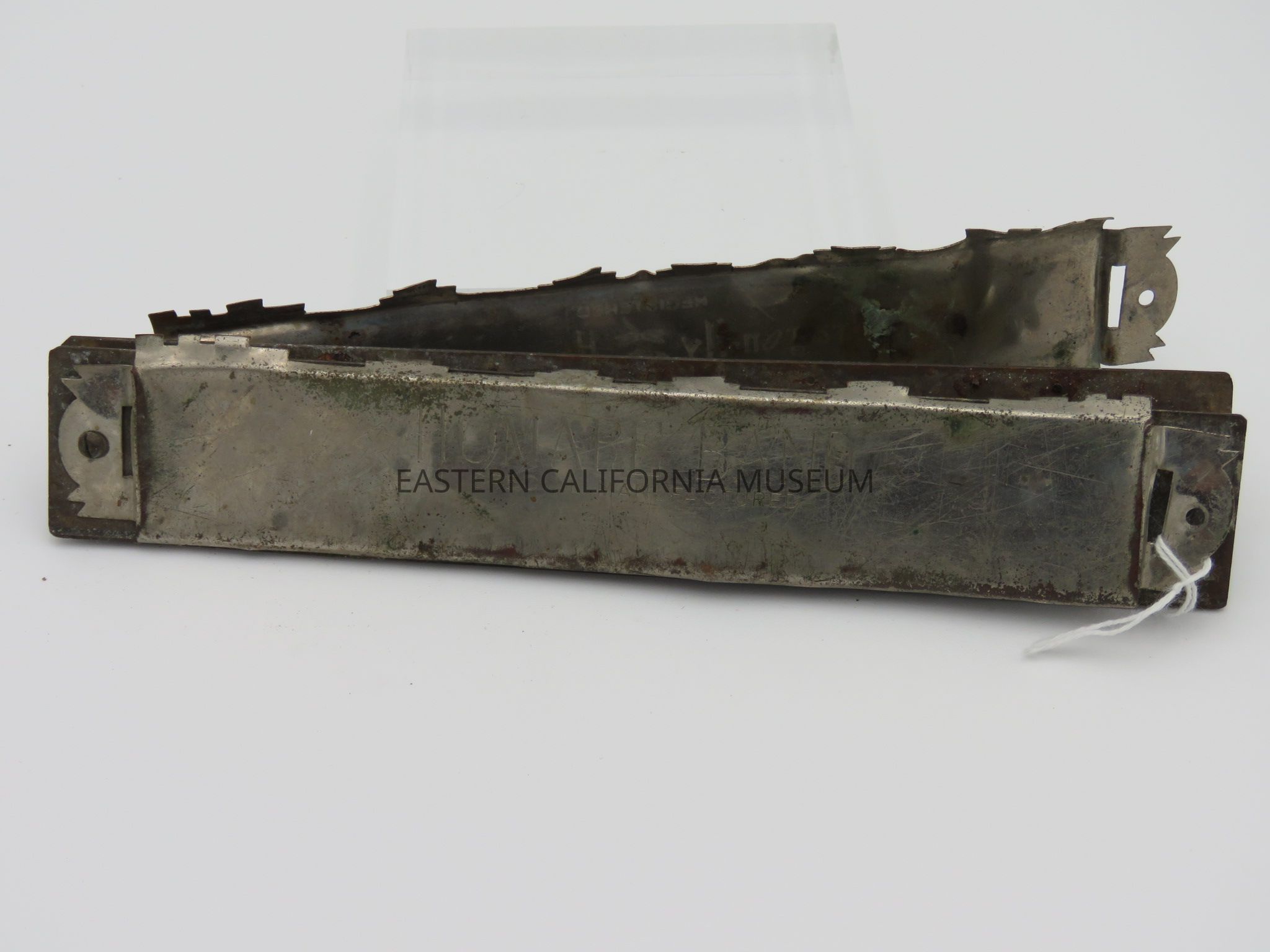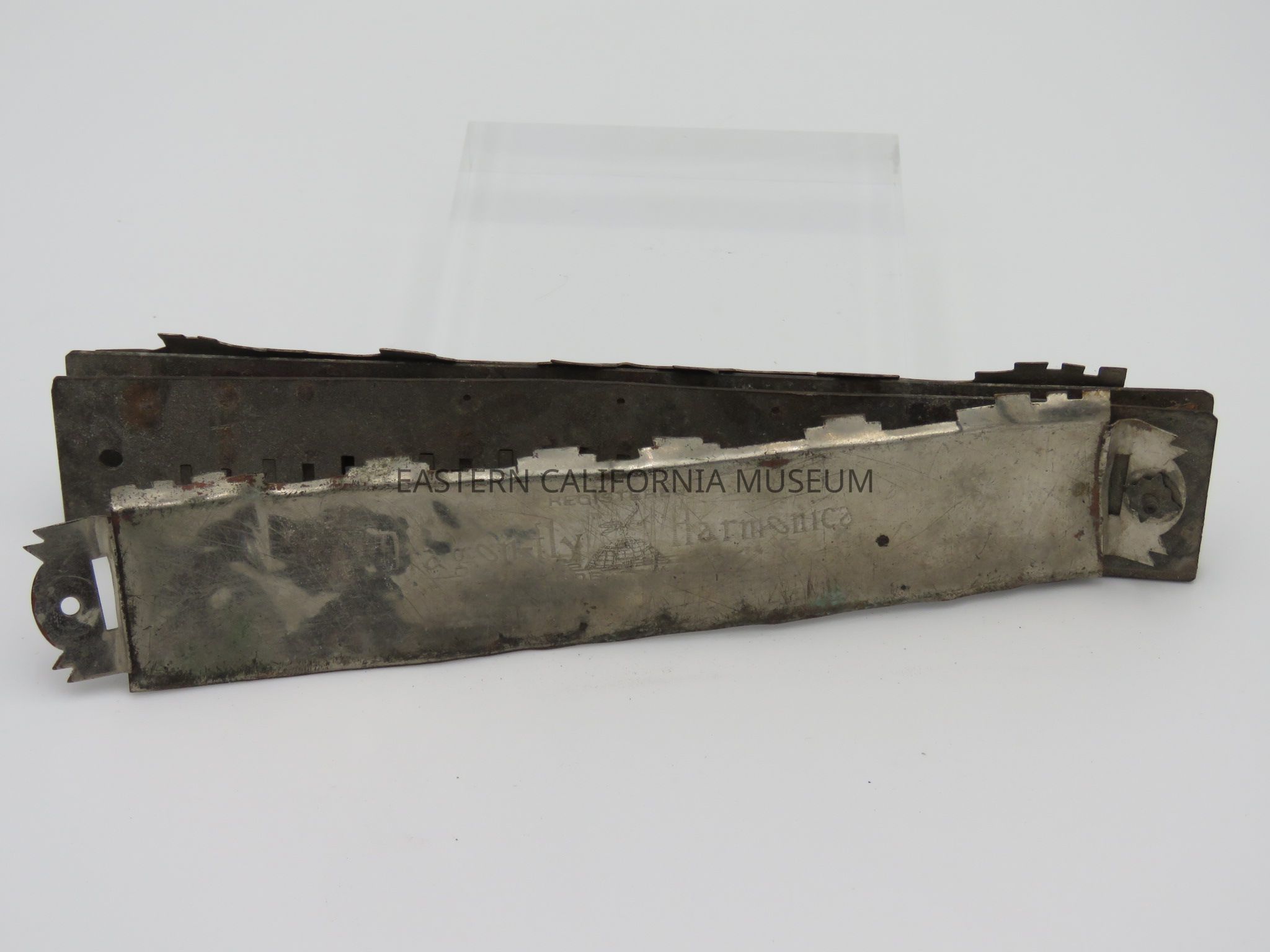 Harmonica found at Manzanar. It has "Registered Dragon-fly Harmonica Trade-mark" on one side and "Homare Band Special Manufactured" on the other. Made in Japan. It is in very poor condition with parts missing.Collection