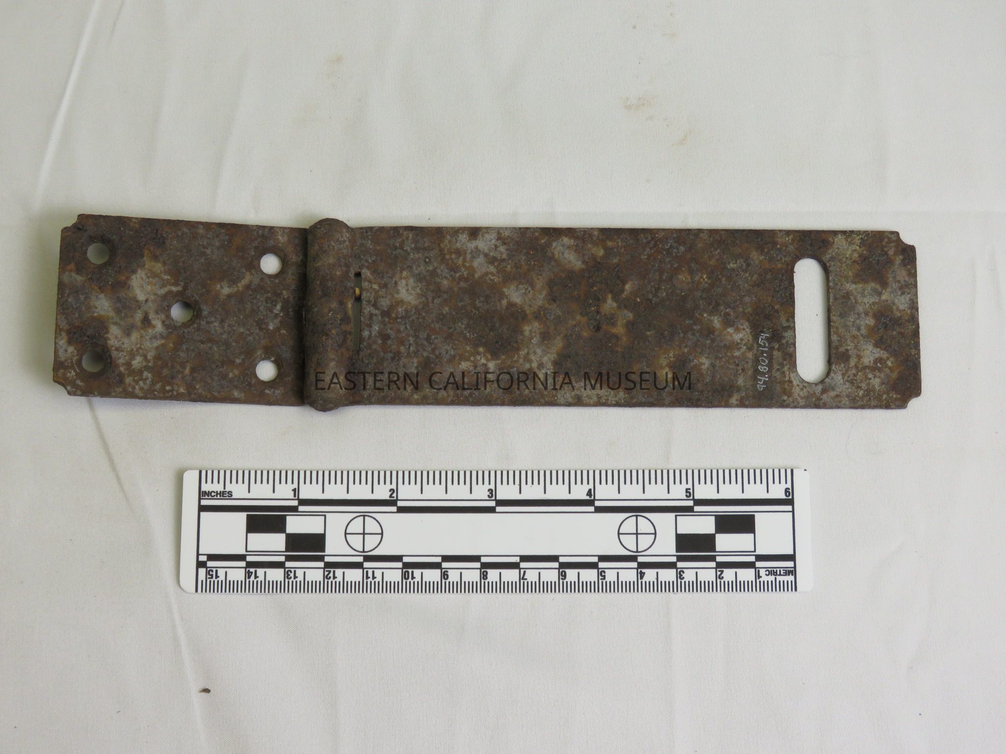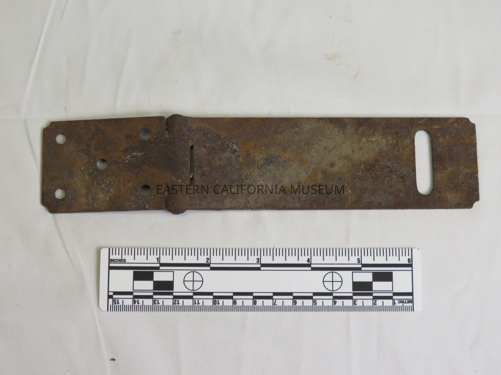 Hasp with five holes for screws. Likely found at Manzanar, CA. It could be from the ranching community of Manzanar (circa 1900-1929), or it could be from the WWII-era Manzanar War Relocation Center.Collection