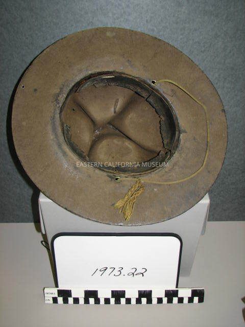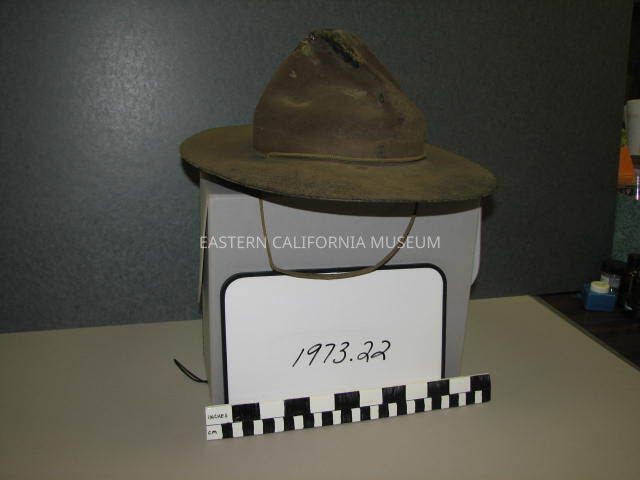Campaign hat that belonged to Norman Clyde, famous mountaineer. He was born on April 8, 1885 in Philadelphia, Pennsylvania and died on December 23, 1972 at the Big Pine Sanatorium. Norman Clyde gave this hat to Elodie and Claude Drew of Independence.