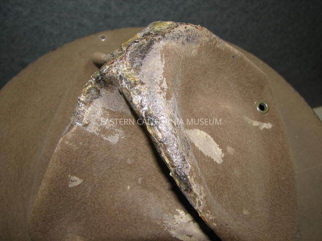 It is 13 3/4" across, brown, well-worn. Looks like resin, glue, or pitch put on hat to mend it. Cord on to keep hat on head. Has unreadable label in band. Top of hat cracked and has been repaired with varnish-like material. Cotton cord, four rivet holes in crown, two rivet holes for cord, one rivet hole at edge of rim center back. Hat's leather interior band is brittle, cracked, very dirty. Wool felt hard and brittle. Extreme wear, dirty. Crown is cracked and covered with some sort of glue. Front edge of brim on left side shows extreme darkening from dirt and hand oils where Norman took it off and on.Collection