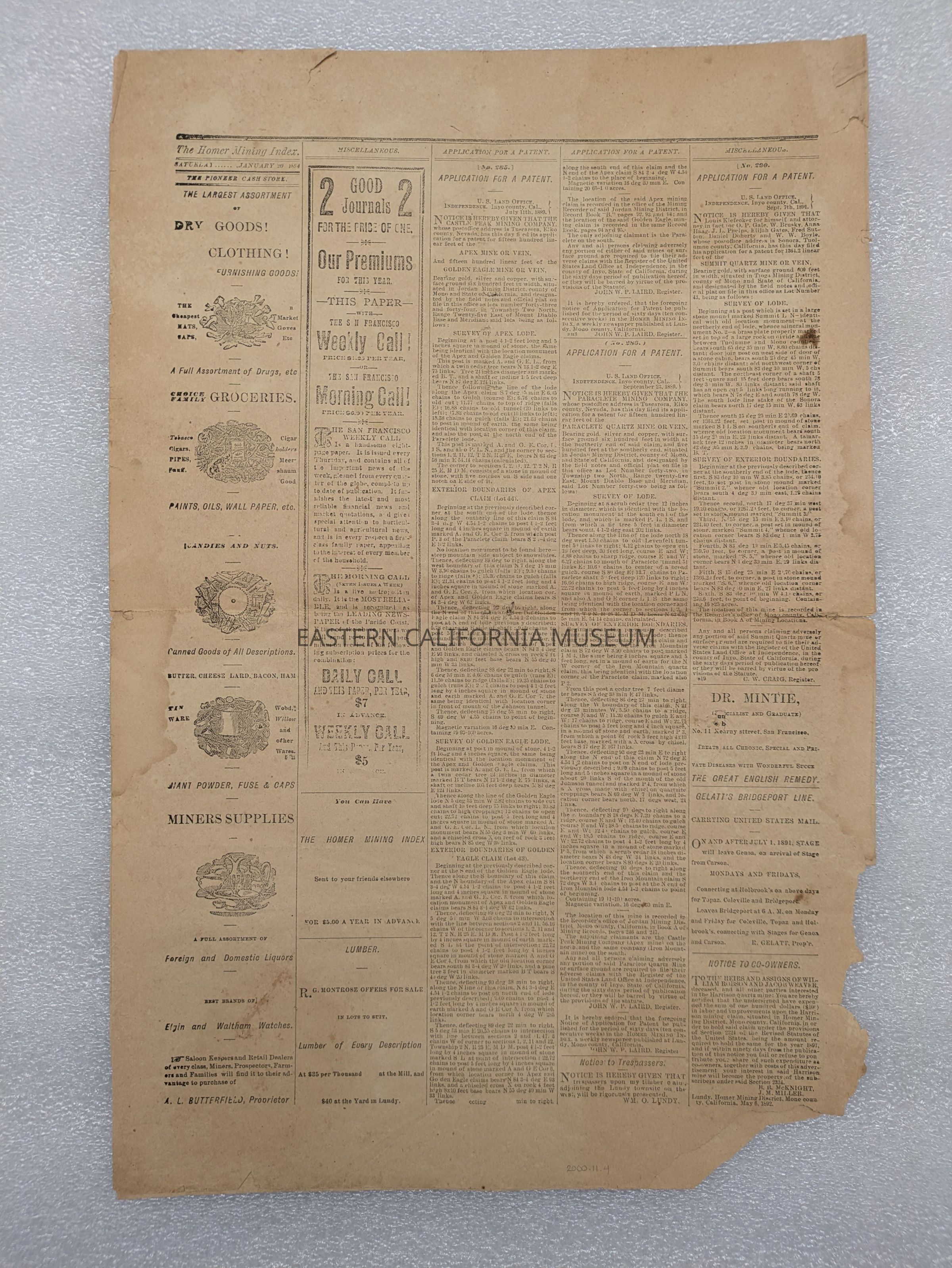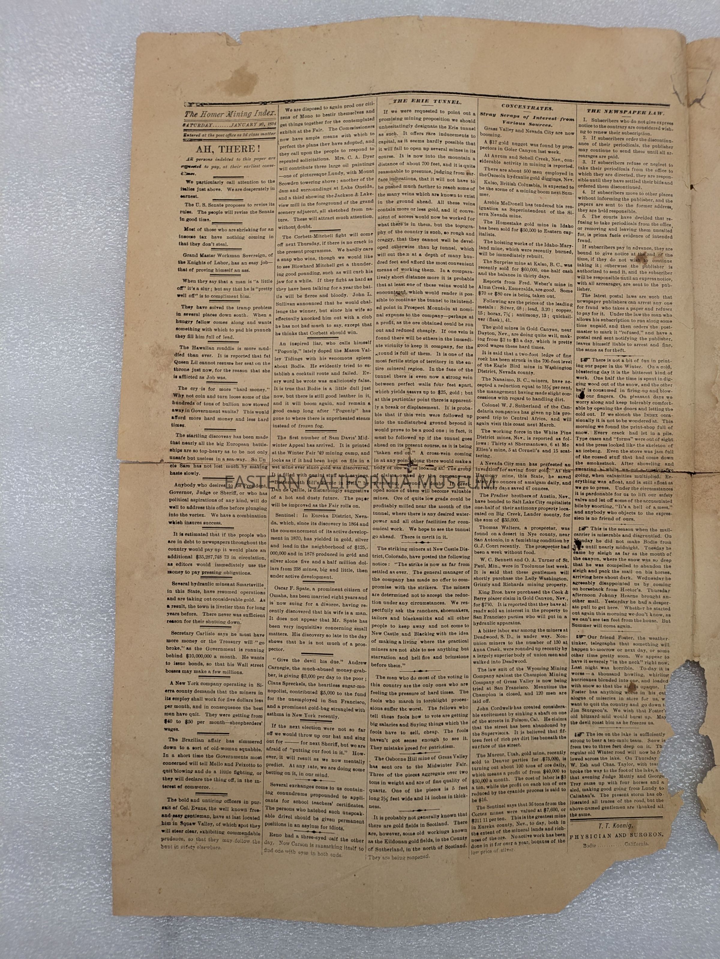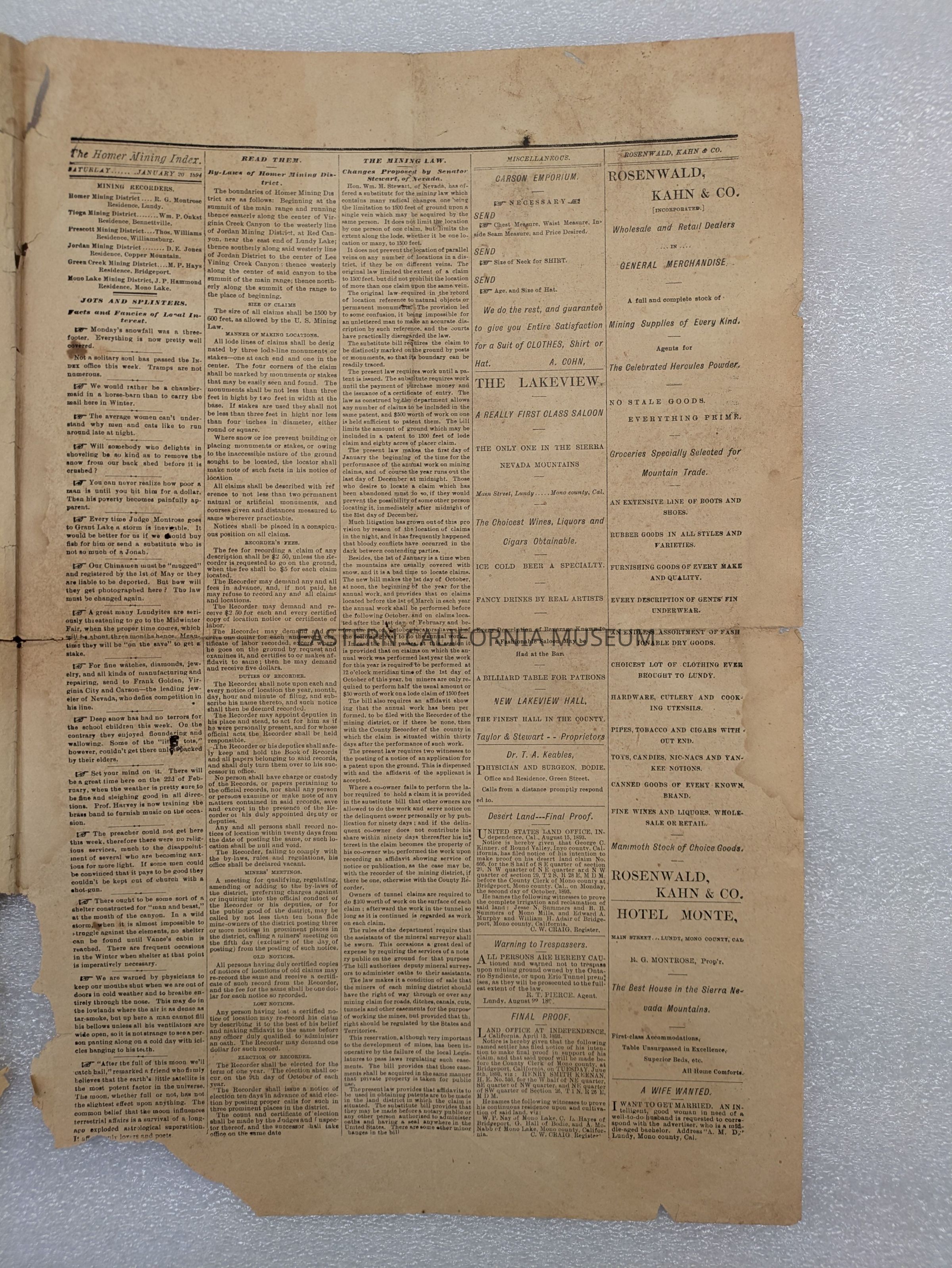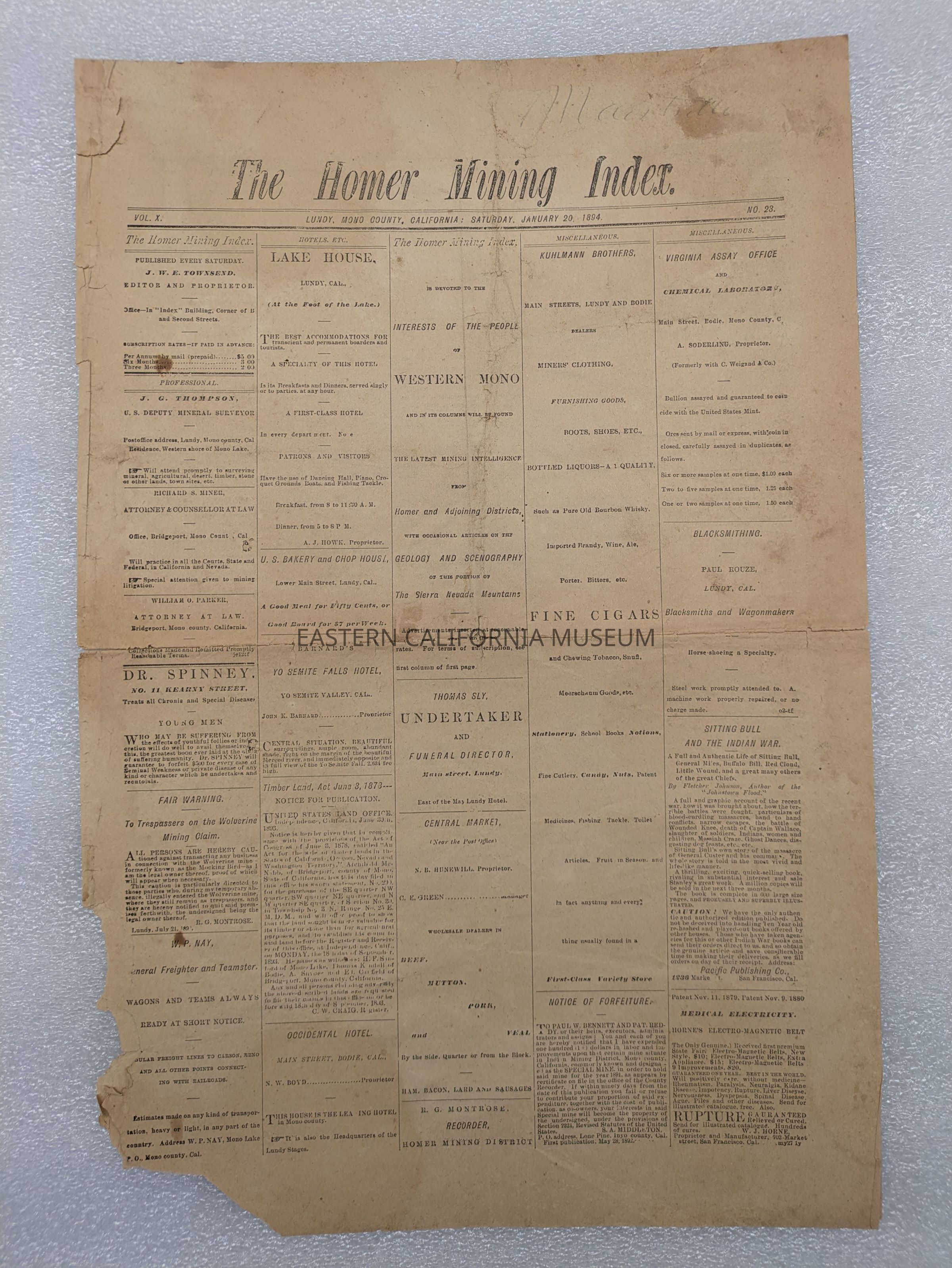 Newspaper: Homer Mining Index, Vol. X, No. 23, January 20, 1894. Published in Lundy, Mono County, CA.Collection