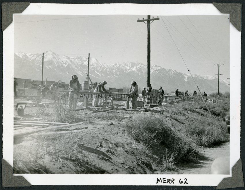 Caption from the Jack Iwata collection: "1 b&w image taken at an unspecified California concentration camp. Exterior shot of men cutting and measuring lumber at work table positioned around utility poles. Scraps of woods on the ground near the workers. They are working in an area elevated from the road. Mountains in the background."Collection