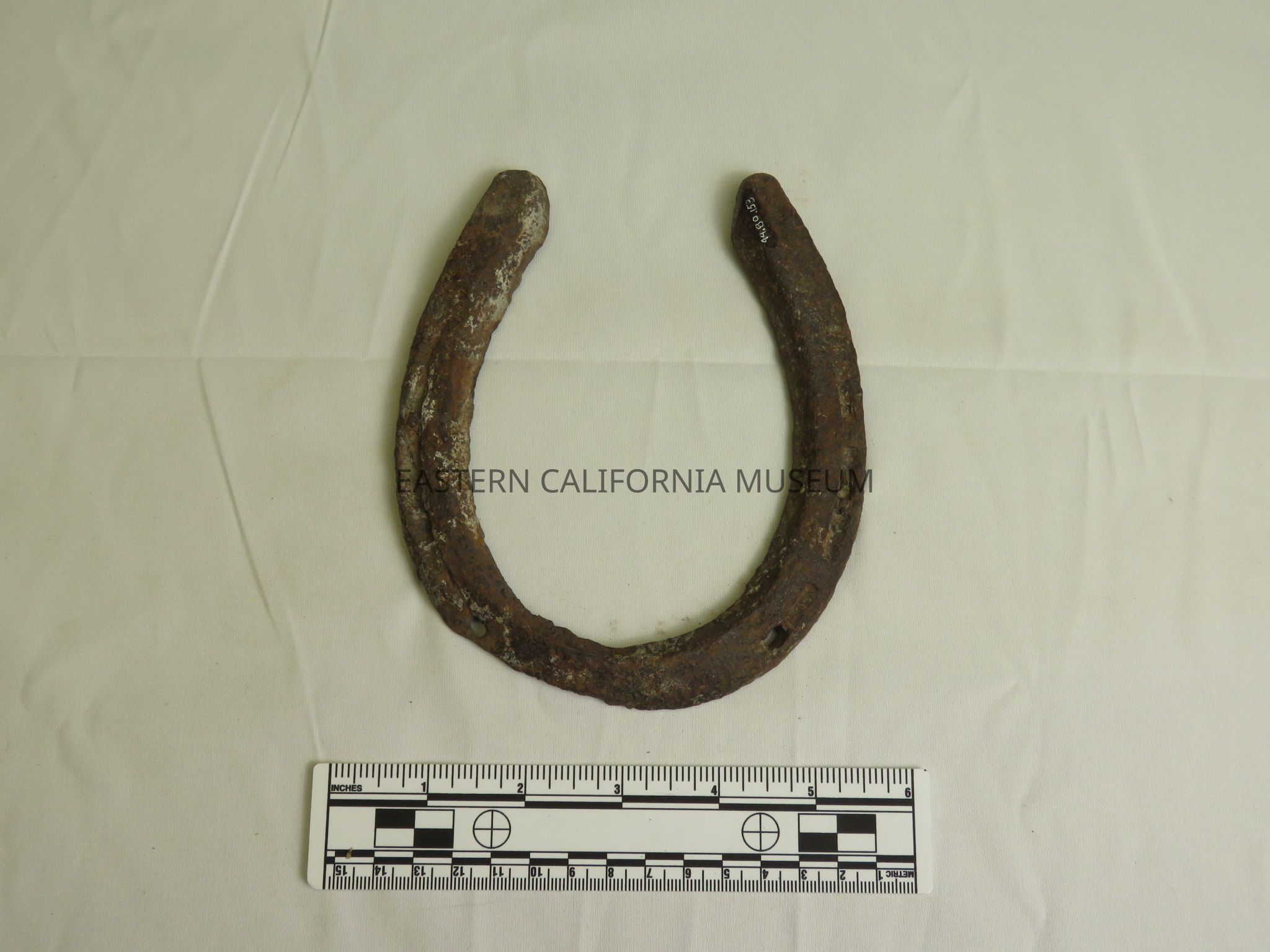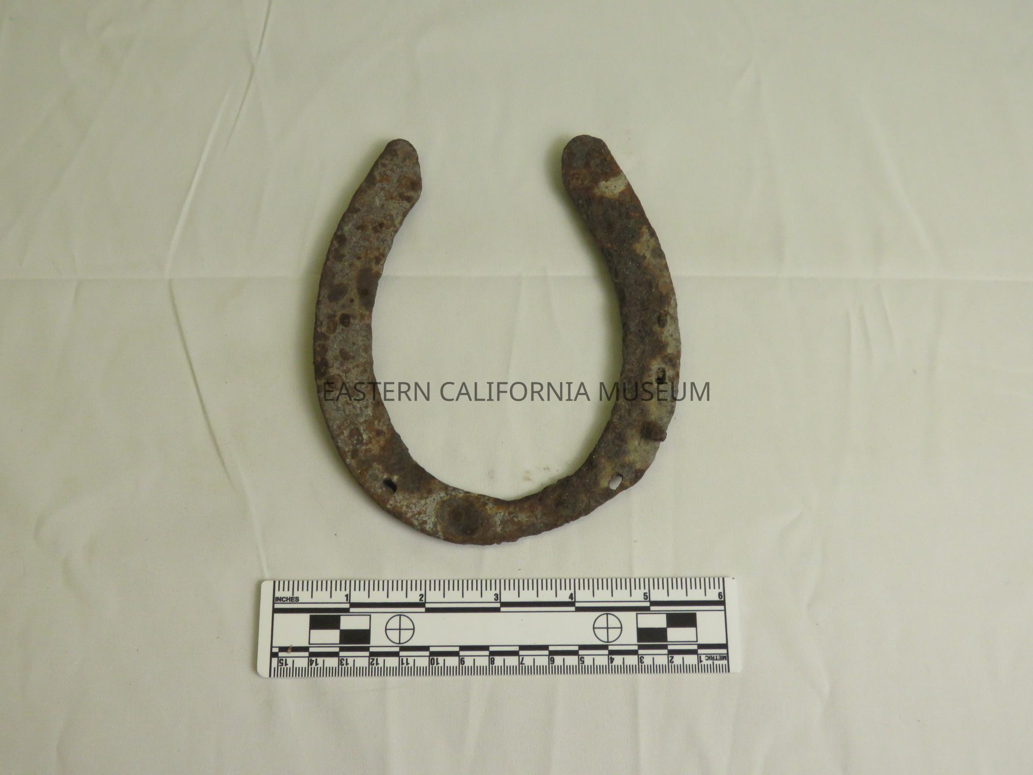 Rusty horseshoe with nail holes that was found at Manzanar. It could be from the ranching community of Manzanar (circa 1900-1929), or it could be from the "Manzanar Mounties" who patrolled Manzanar War Relocation Center.Collection