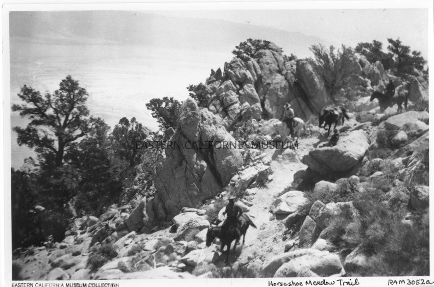 B&W glossy print: horseback riders coming down a steep mountain trail