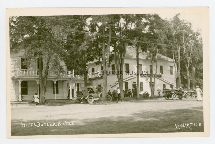 Photo postcard of two beautiful white two story buildings connected by a walkway with a row of trees in front. There are people and vehicles parked in the dirt street in front of them. The building on the right has a large sign that says, "Hotel Butler." The photo is labeled, "Hotel Butler, Big Pine," and was taken by photographer H. W. Mendenhall and given his photo #108.Collection