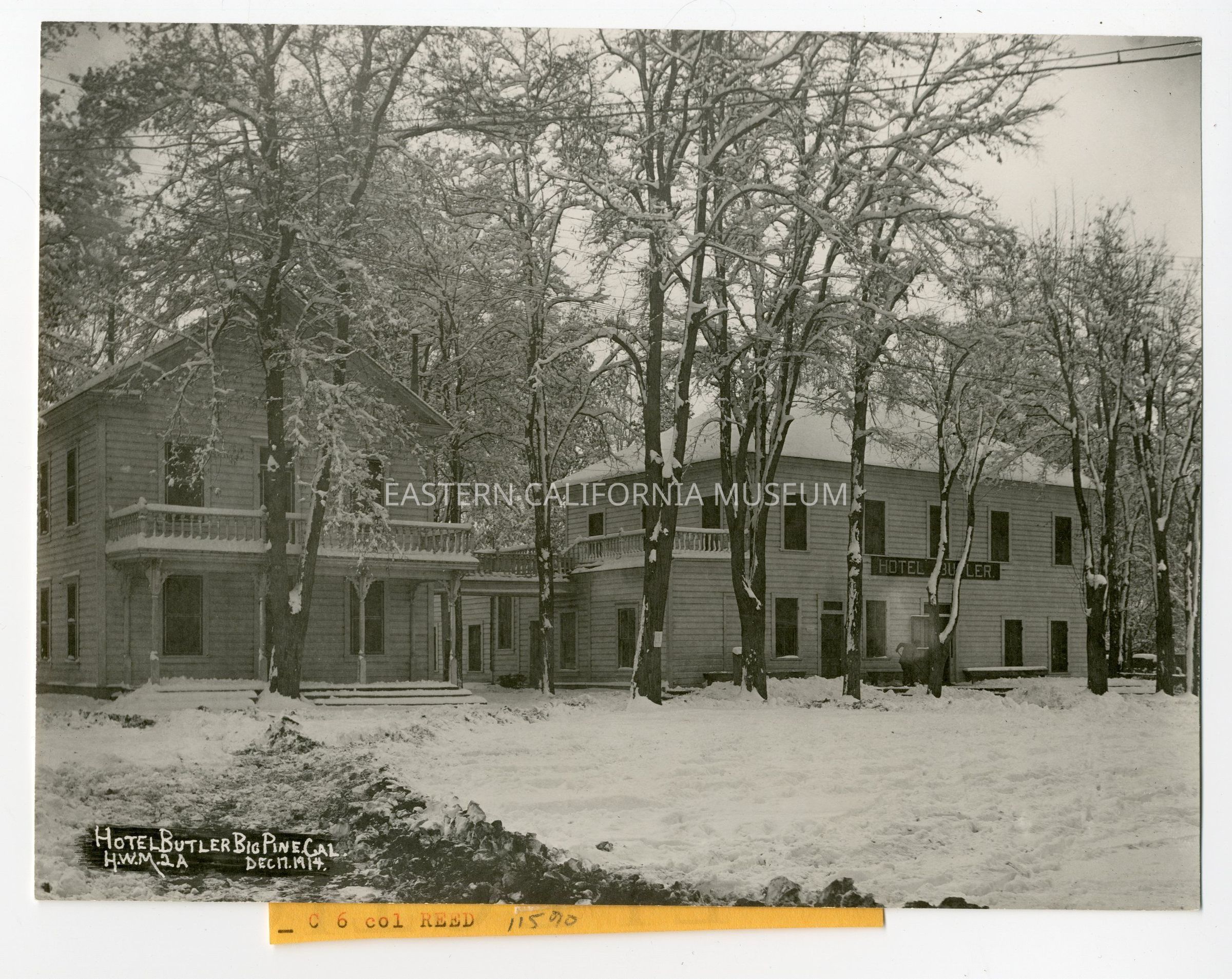 Photo titled, "Hotel Butler, Big Pine, Cal." taken by Harry Mendenhall on 12/17/1914 and given his ID #2A. It was taken after a snow storm. There is a man shoveling snow near the front door.