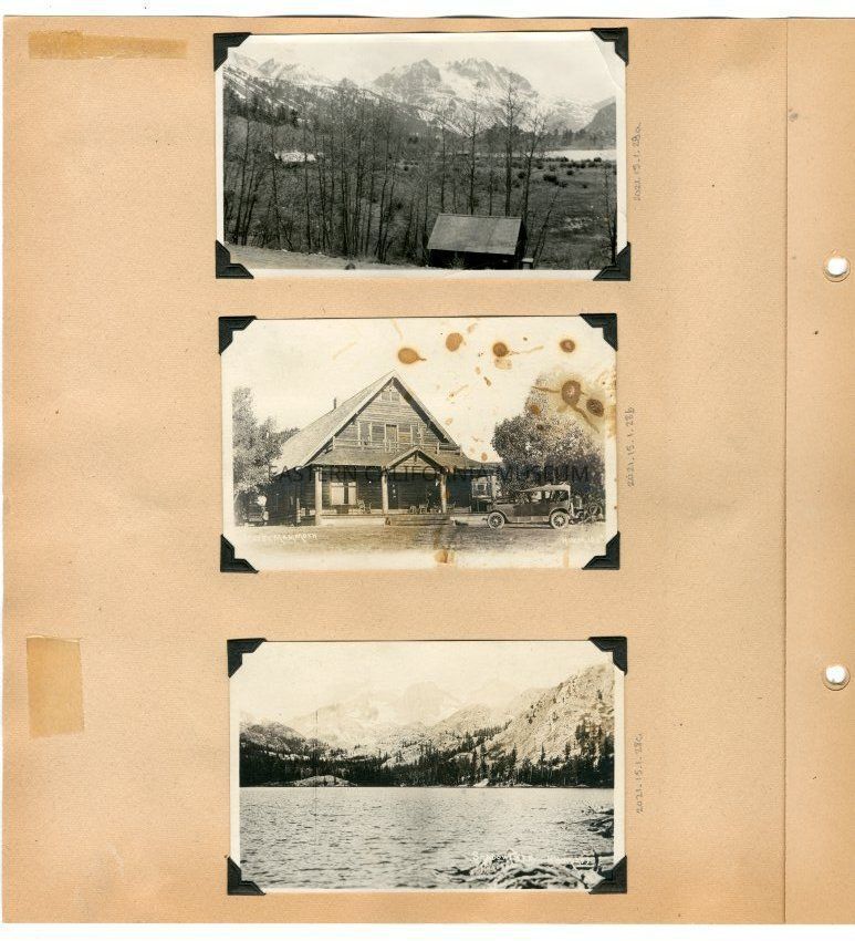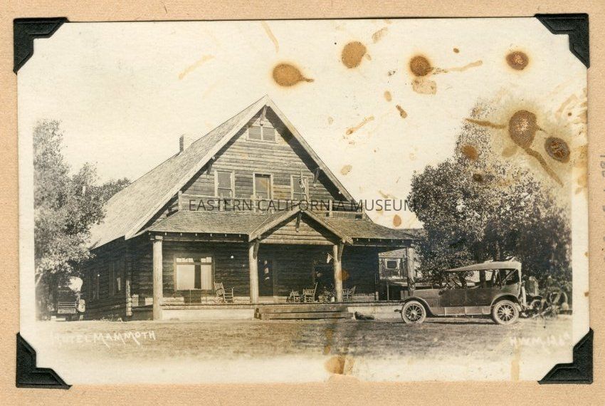 Photo postcard of a log lodge with an old vehicle parked in front of it. It is titled, "Hotel Mammoth" and was taken by H. W. Mendenhall and given his photo #126a.Collection