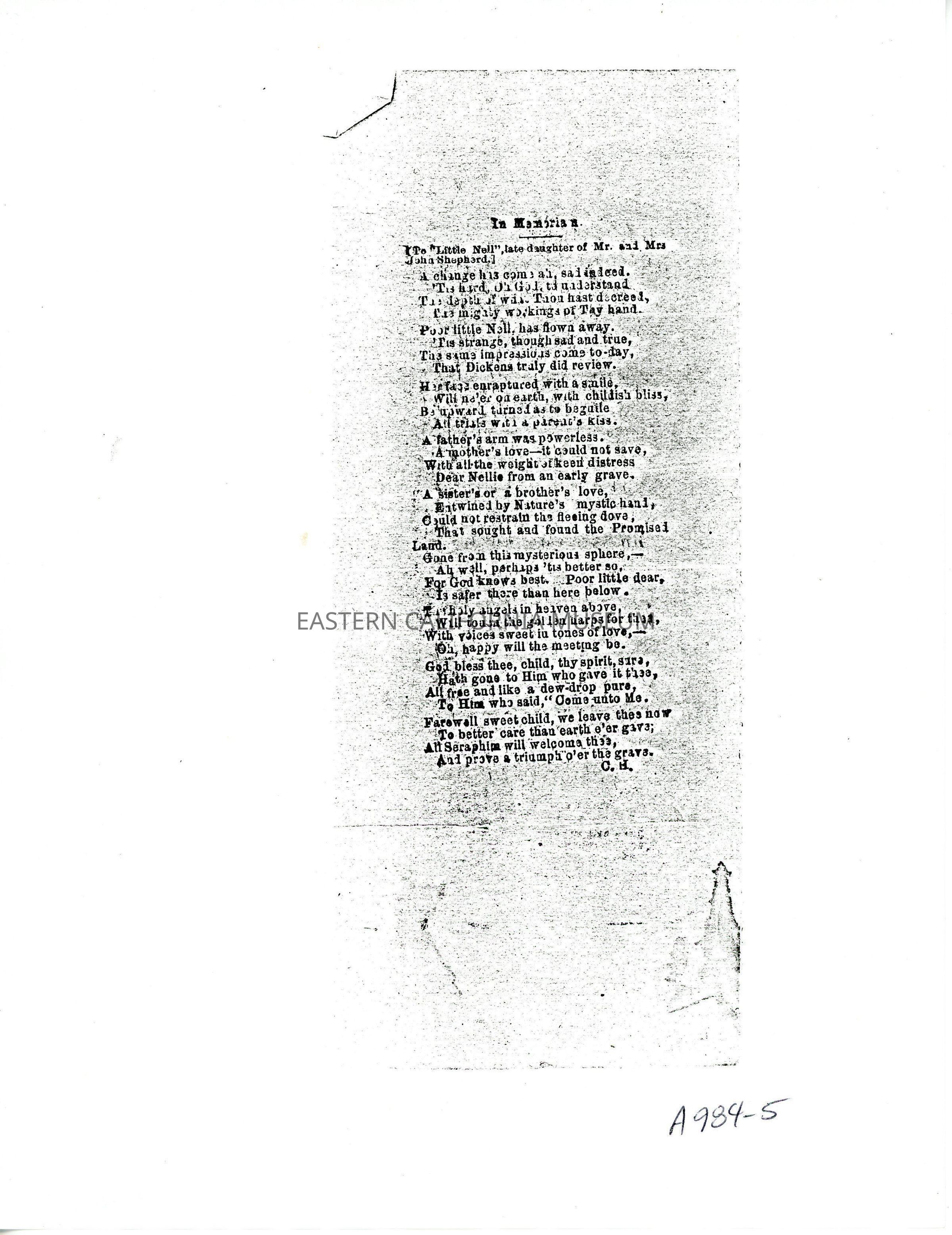 Photocopy of a poem titled, "In Memoriam" and dedicated to "Little Nell" the late daughter of Mr. and Mrs. John Shepherd. Author's initials are C.H.