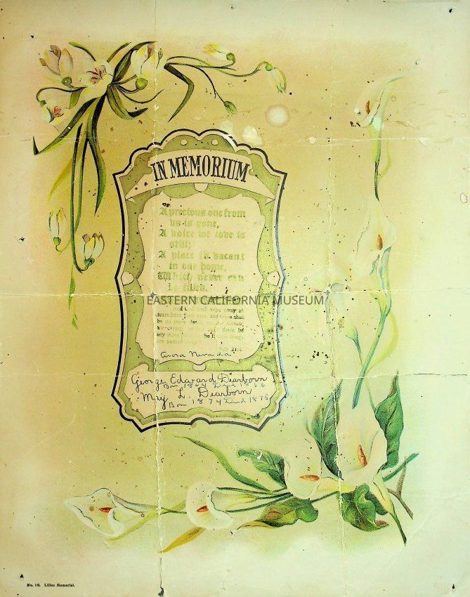 Large poster-like document commemorating the death of two children: George Edward Dearborn, born 1864 and died 1866, and May L. Dearborn, born 1874 and died 1875. They died in Aurora, Nevada.Collection