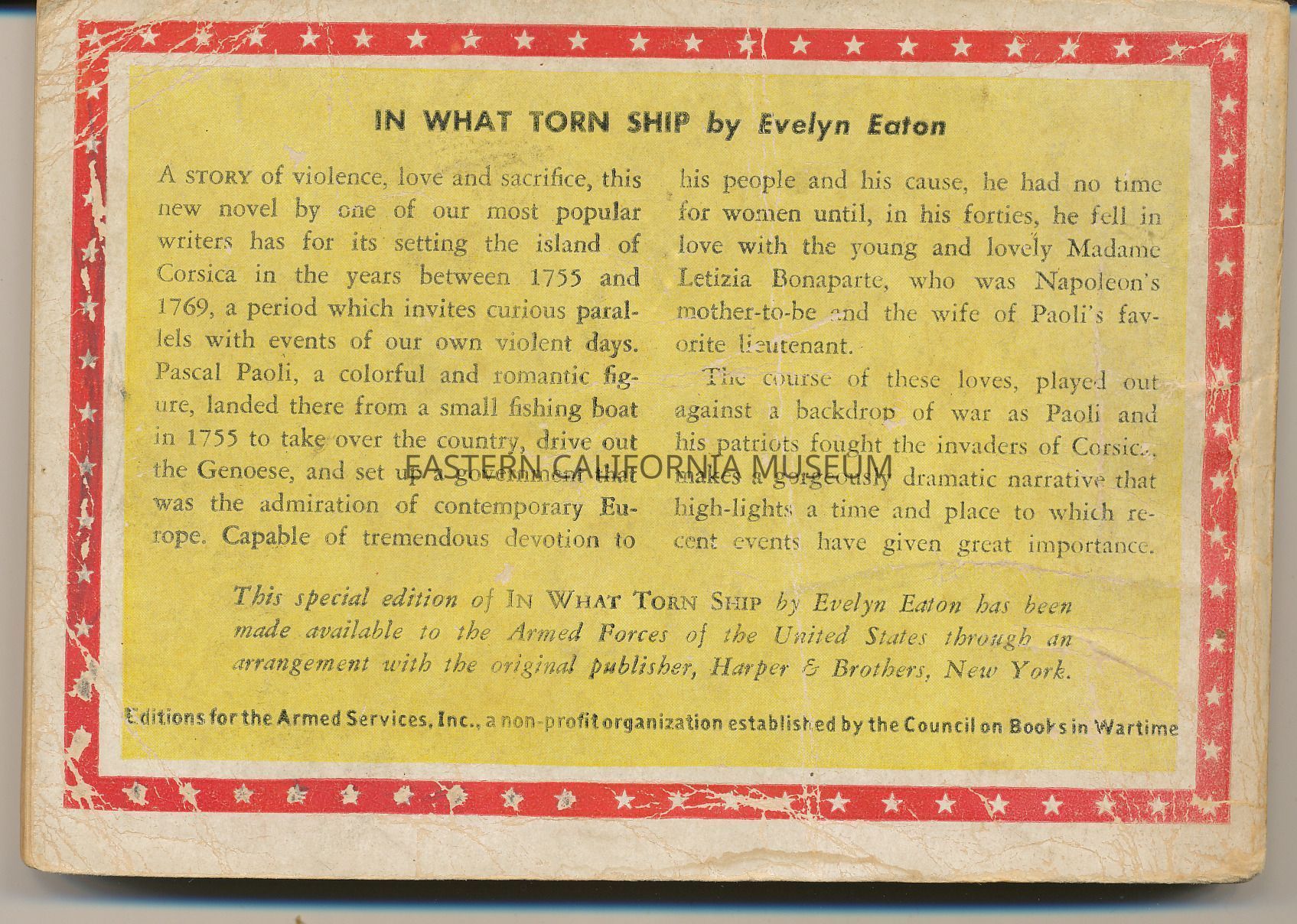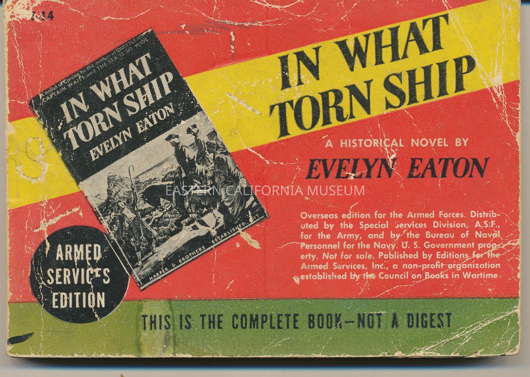 Paperback book, Armed Services Edition. Historical novel. Yellow band upper half of book at an upward tilted angle with title and part of front cover image of full size novel in black and white reduced and imposed on this book front. Yellow band on red background with a green band at the bottom with statement that this is the complete book -- not a digest.Book Details