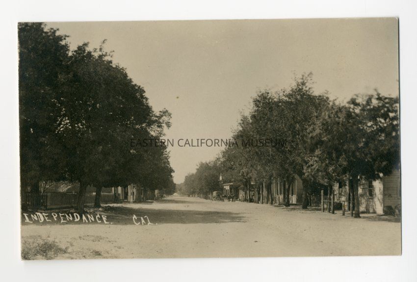 Photo postcard of the main street in Indpendence. Shows wide dirt road with buildings lining each side. Lots of trees shade the businesses. No signs are visible. There is a horse drawn buggy parked along the right side. It is labled "Independance [sic], Cal."
