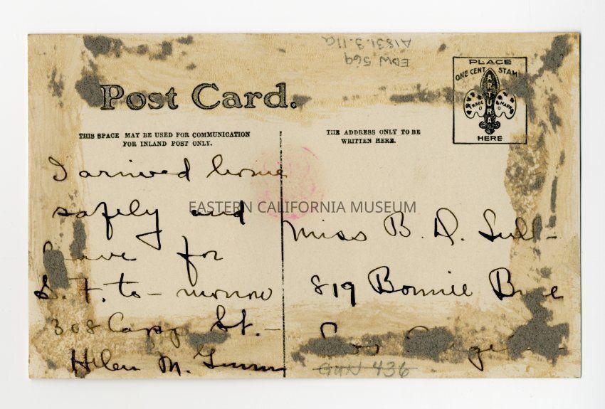 The postcard was written by Helen M. Gunn to Miss B. D. Lull of Los Angeles. "I arrived home safely and leave for S. F. [San Francisco] to-morrow. 308 Capp St." There is no stamp or cancellation mark, so likely never sent.