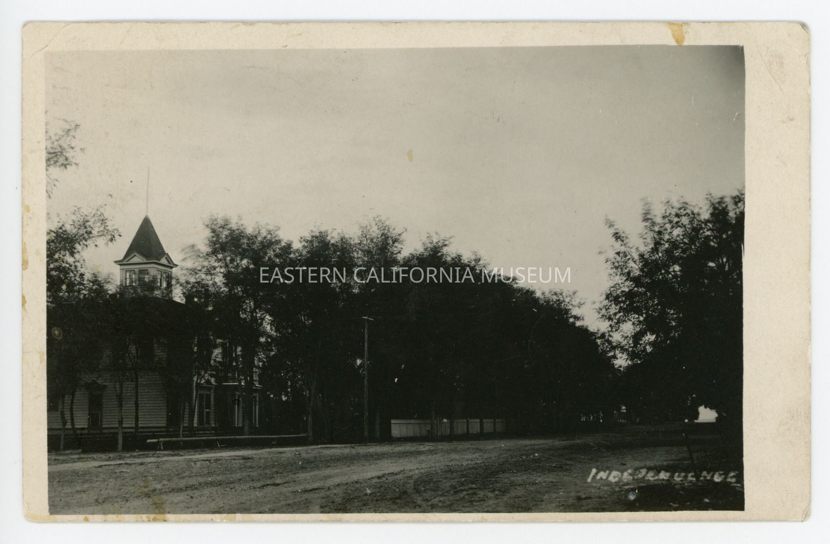 Photo postcard titled, "Independence." It shows the third courthouse on the left with the dirt, tree-lined road running beside it.