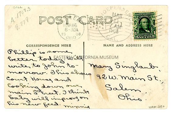 It was postmarked in Independence on March 11, 1908 and has a green one cent Benjamin Franklin stamp. It was mailed to Mary Singlaub in Salem, Ohio from Minnie [Brooks] and says, "Phillip is some better today. Will write to John tomorrow. This shows Court House and looking down our Main Street. I think baby will improve on his new feed."Photograph Details