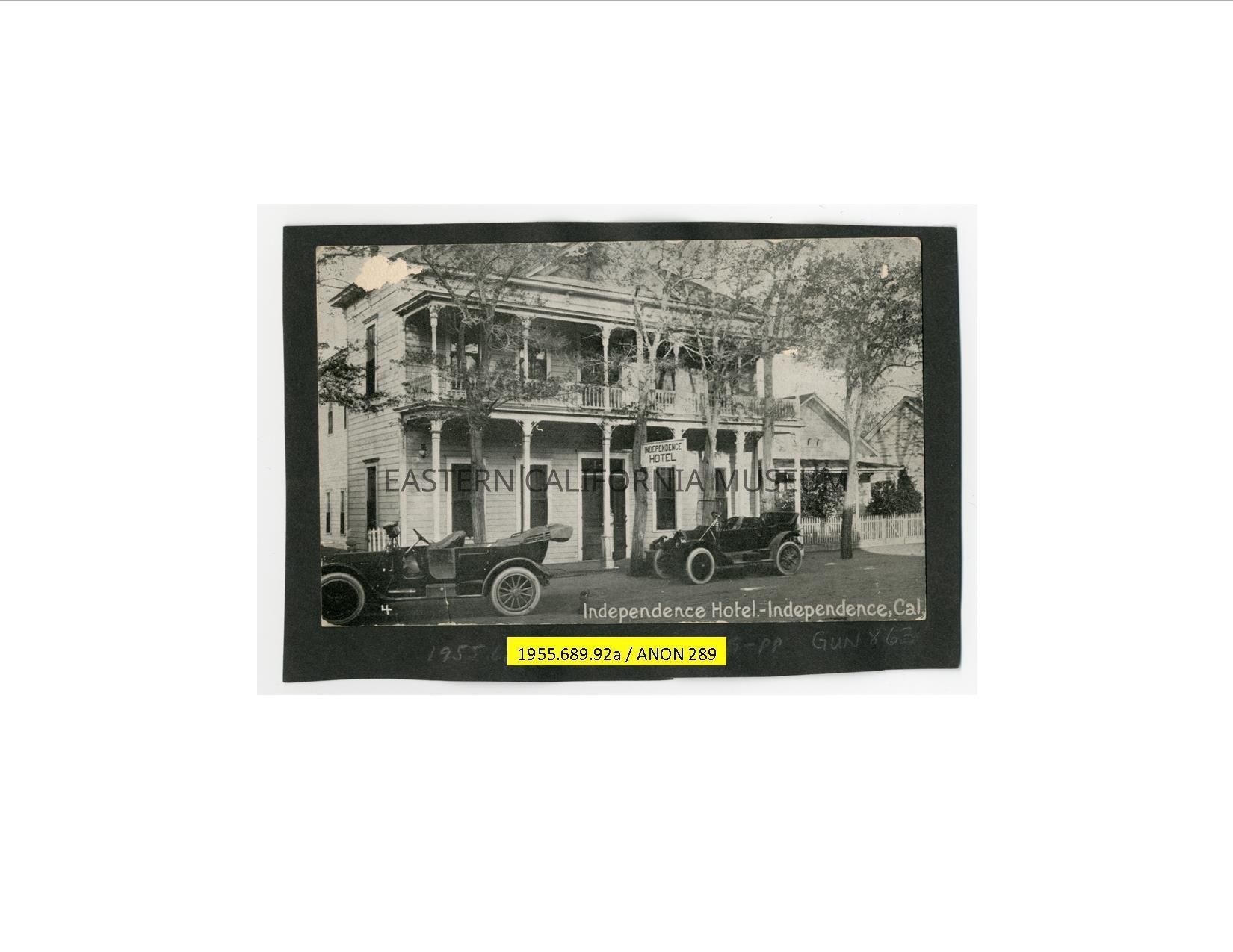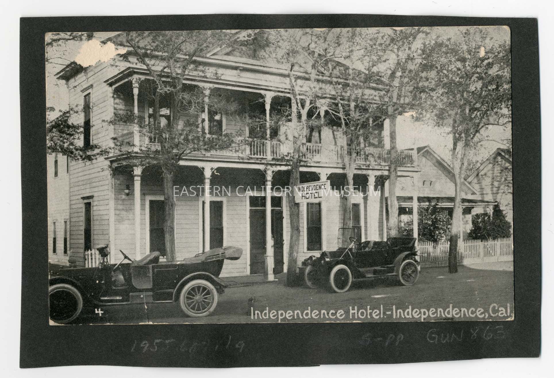 Photo of the two story Independence Hotel. There are two convertible vehicles parked in front (the one on the left has the number "4" written beneath it).