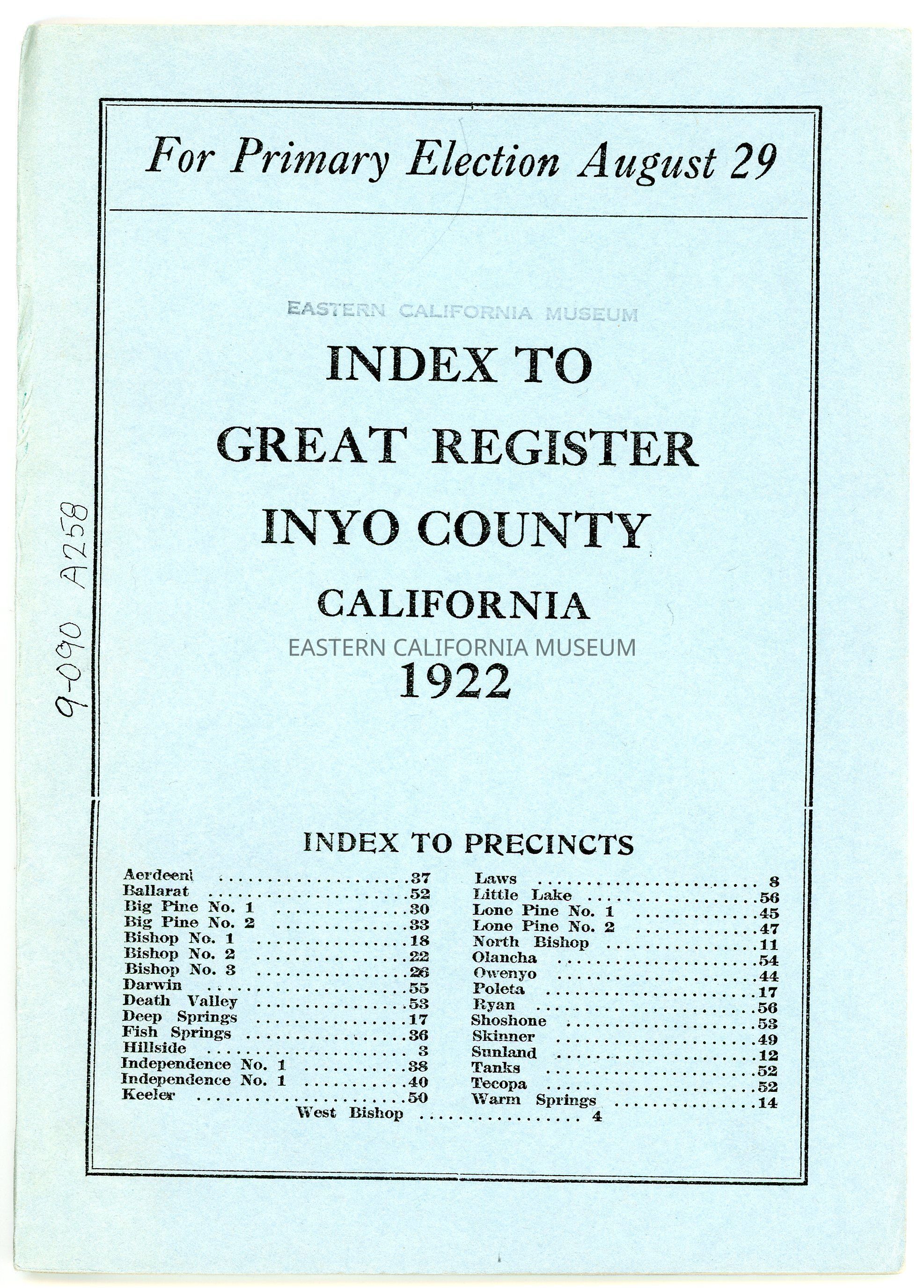 Index to Great Register, Inyo County, California for Primary Election, August 29, 1922