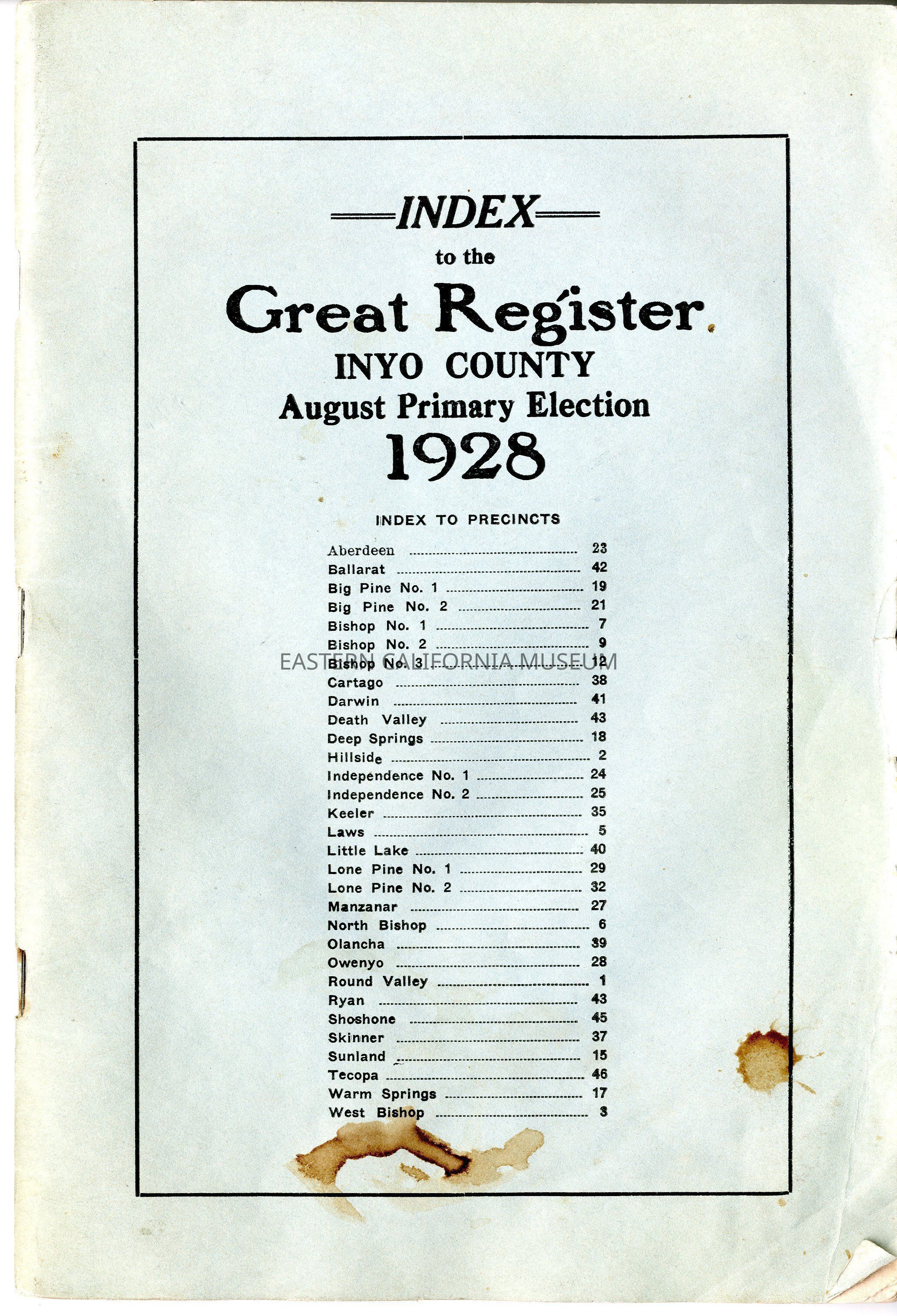(Anonymous) (August 1928) The Index to the Great Register for the Inyo County August Primary Election of 1928. Contains lists of precincts, names, occupations, addresses, and political affiliations of residents. (46 pages)Collection