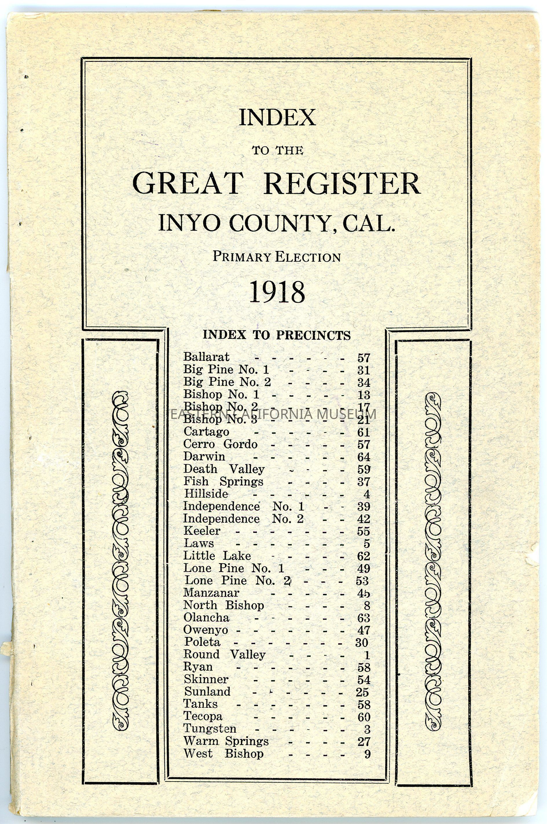 Index to the Great Register, Inyo County, Cal., Primary Election, 1918