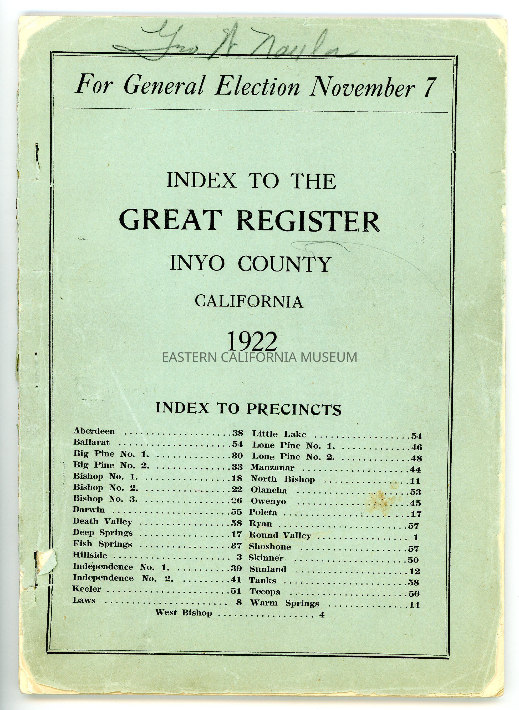 Index to the Great Register, Inyo County, California, for General Election November 7, 1922Entry/Object ID
