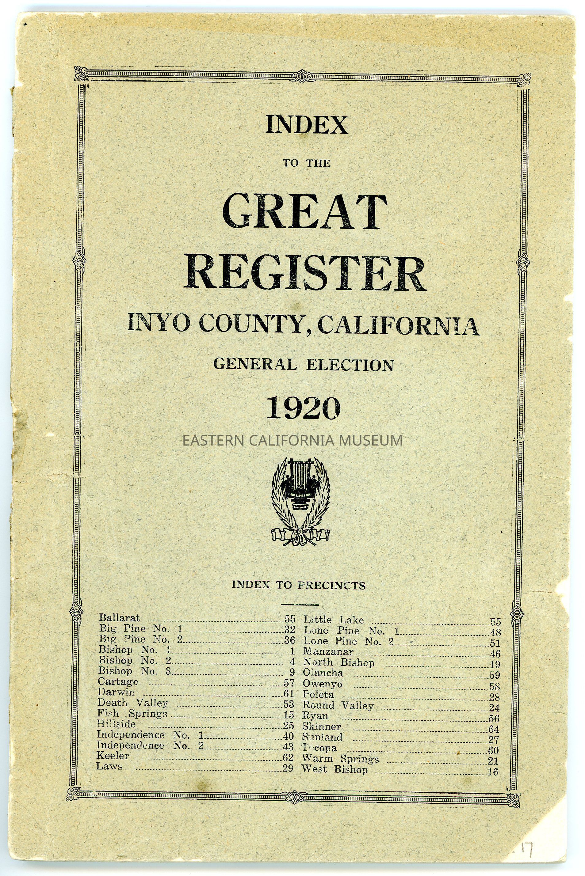 Index to the Great Register, Inyo County, California, General Election, 1920Entry/Object ID