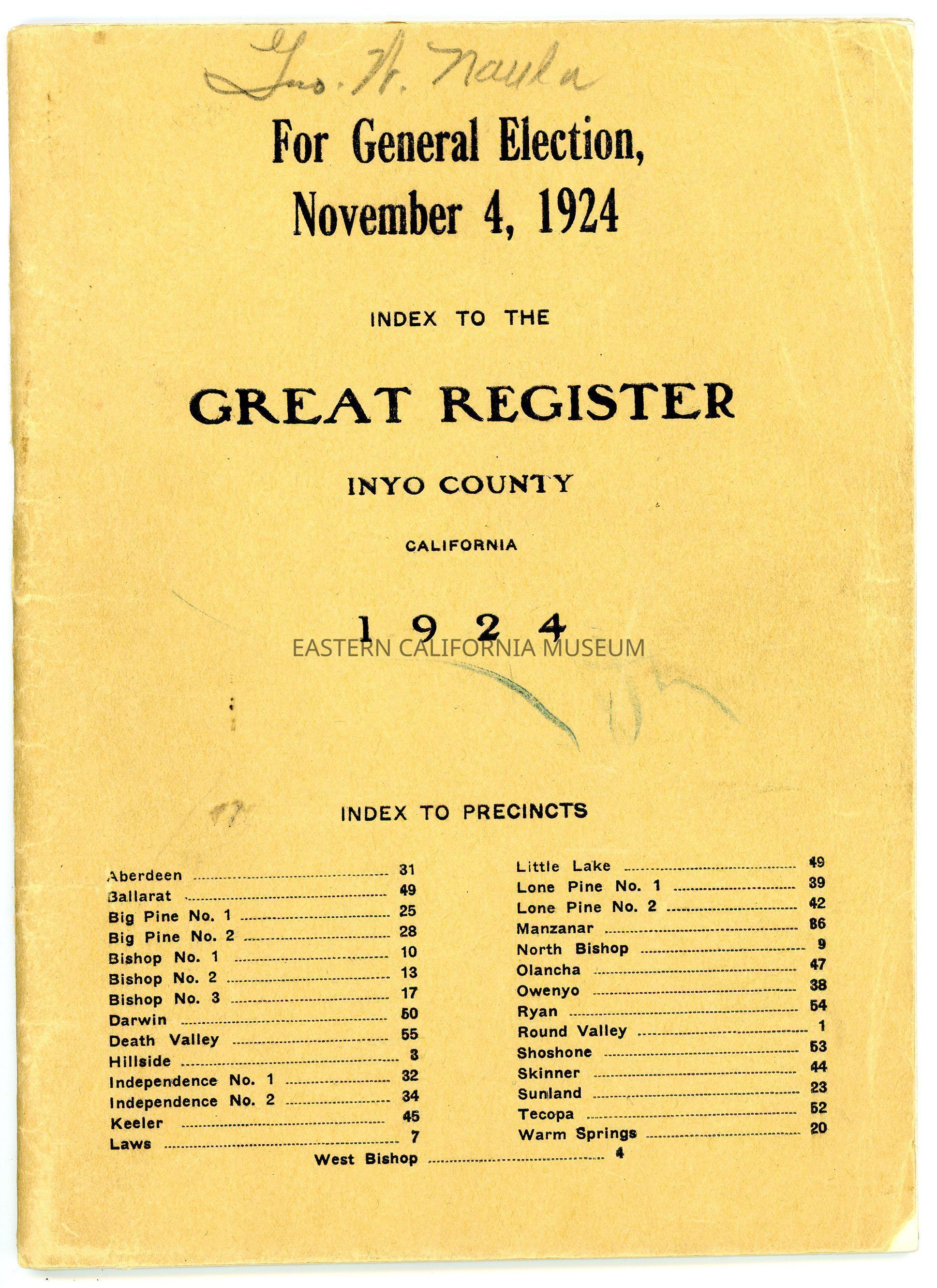 Index to the Great Register, Inyo County, California, General Election, November 4, 1924.