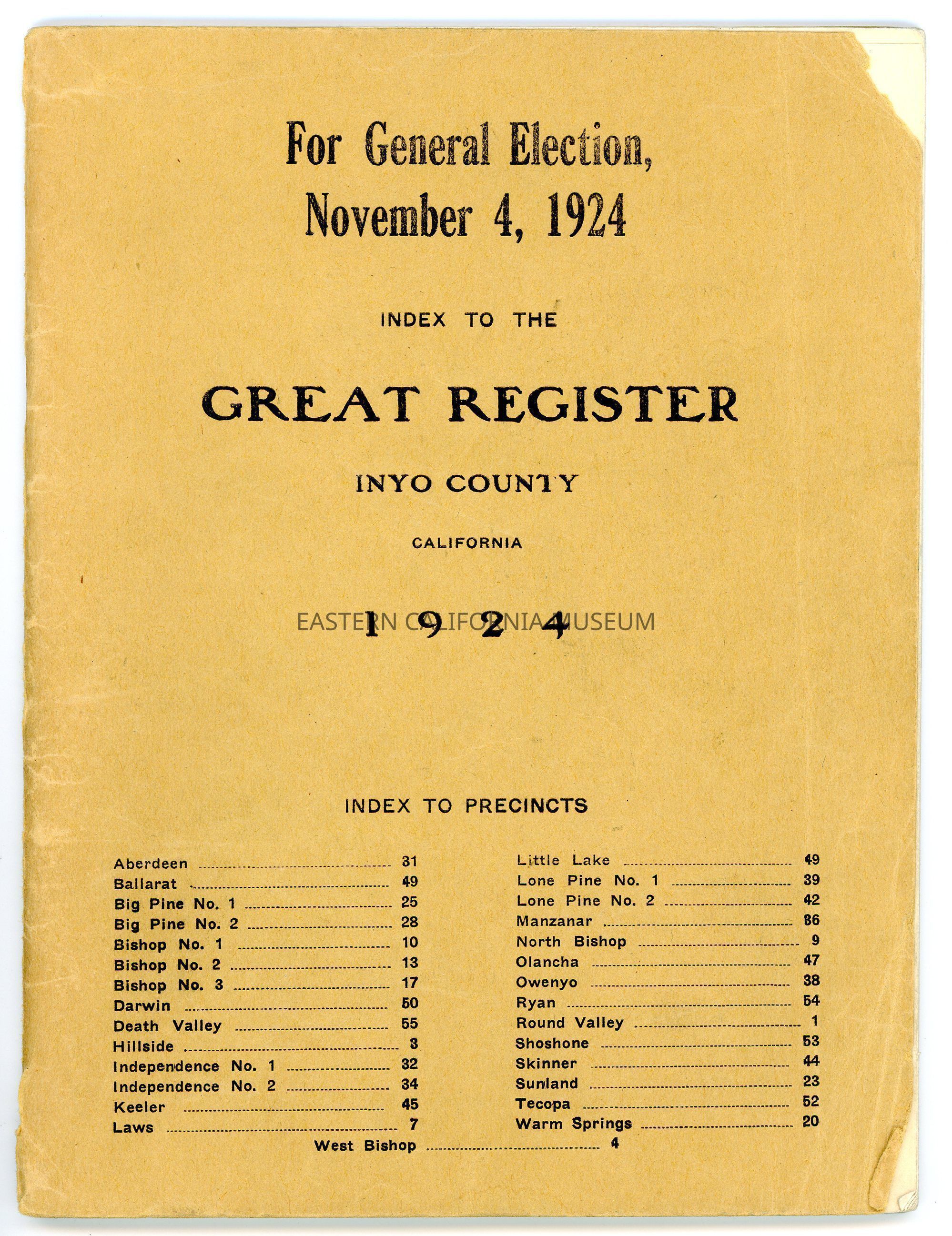 Index to the Great Register, Inyo County, California, General Election, November 4, 1924.Collection
