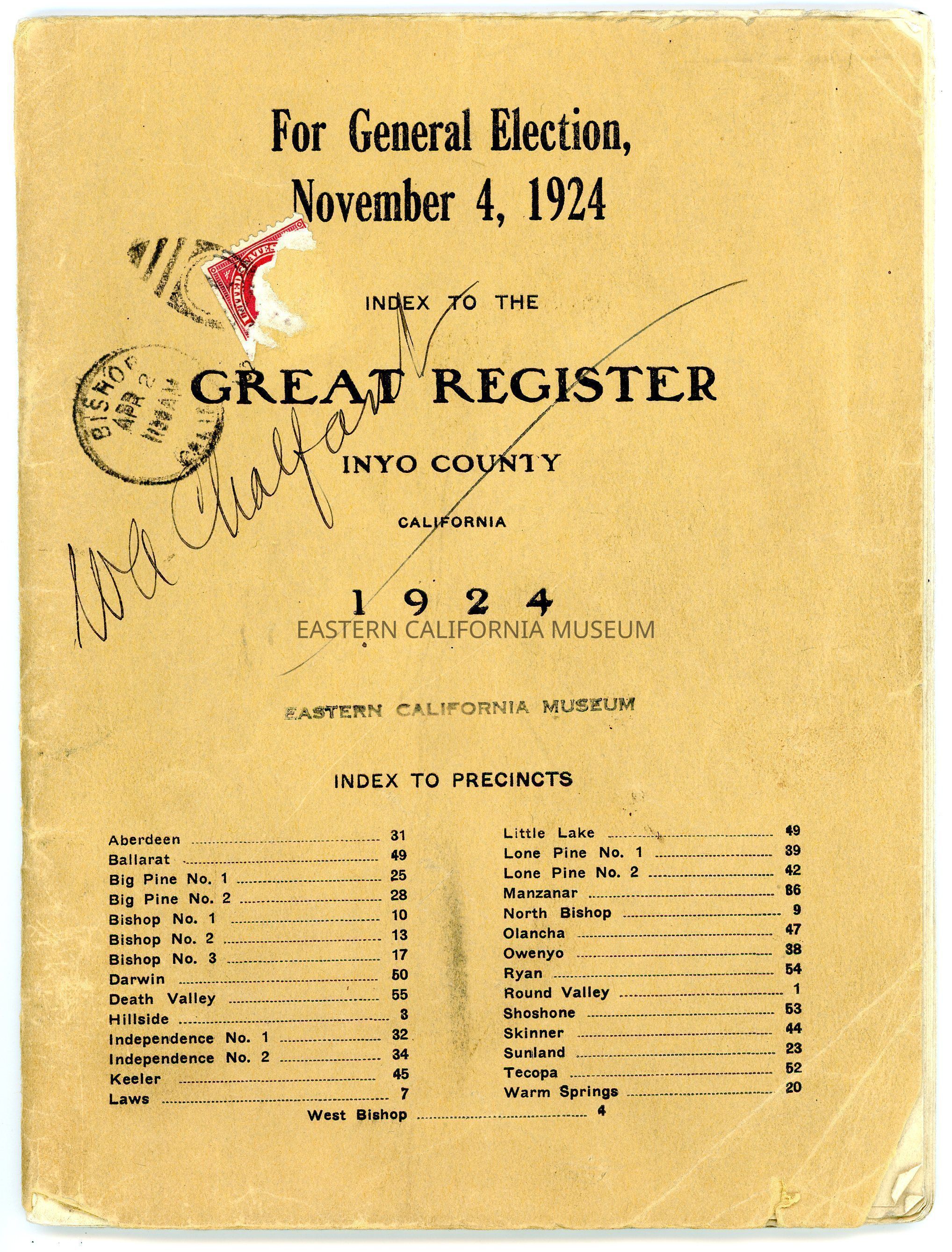 Index to the Great Register, Inyo County, California, General Election, November 4, 1924.