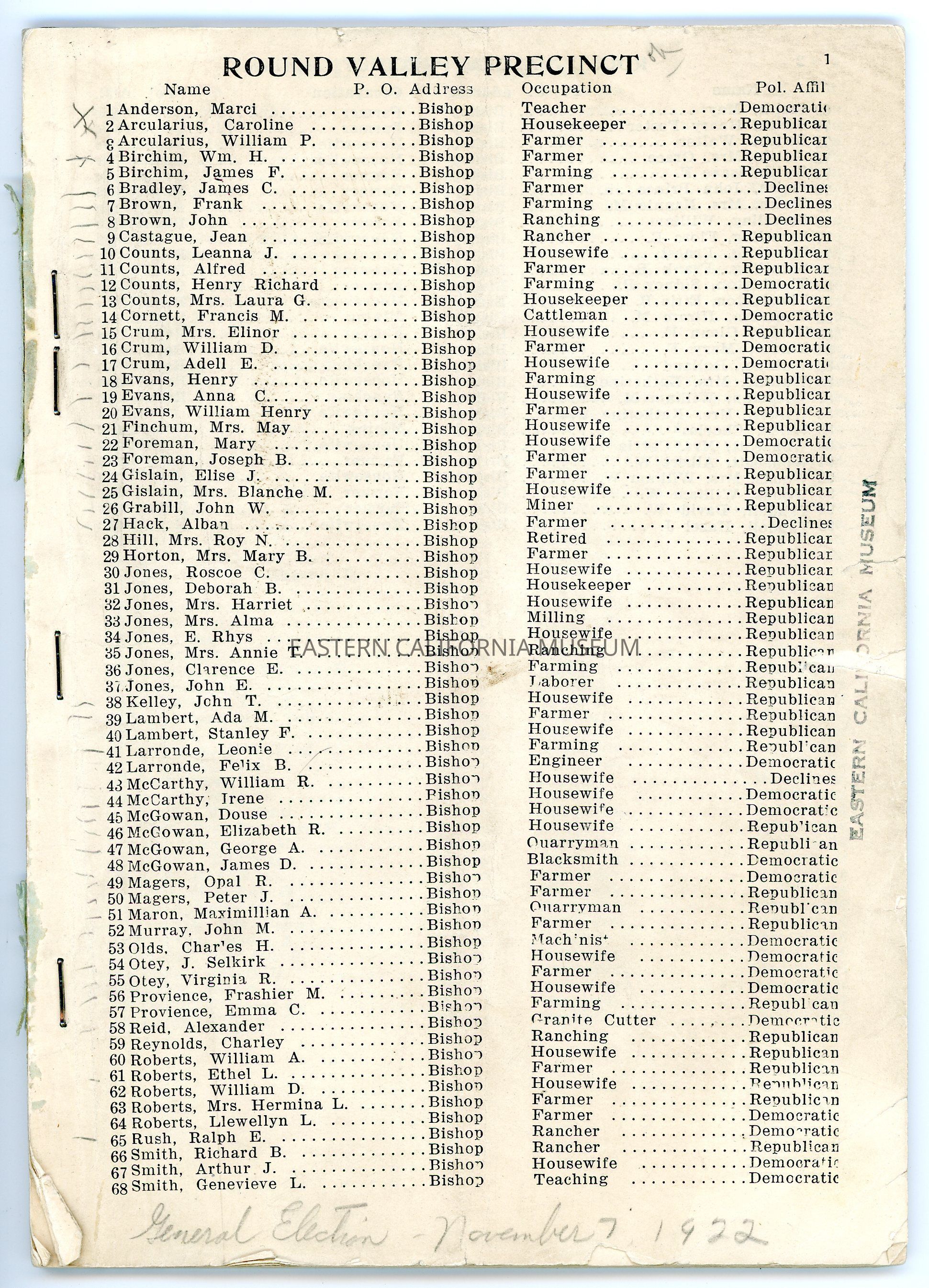 Index to the Great Register, Inyo County, California, General Election, November 7, 1922Entry/Object ID