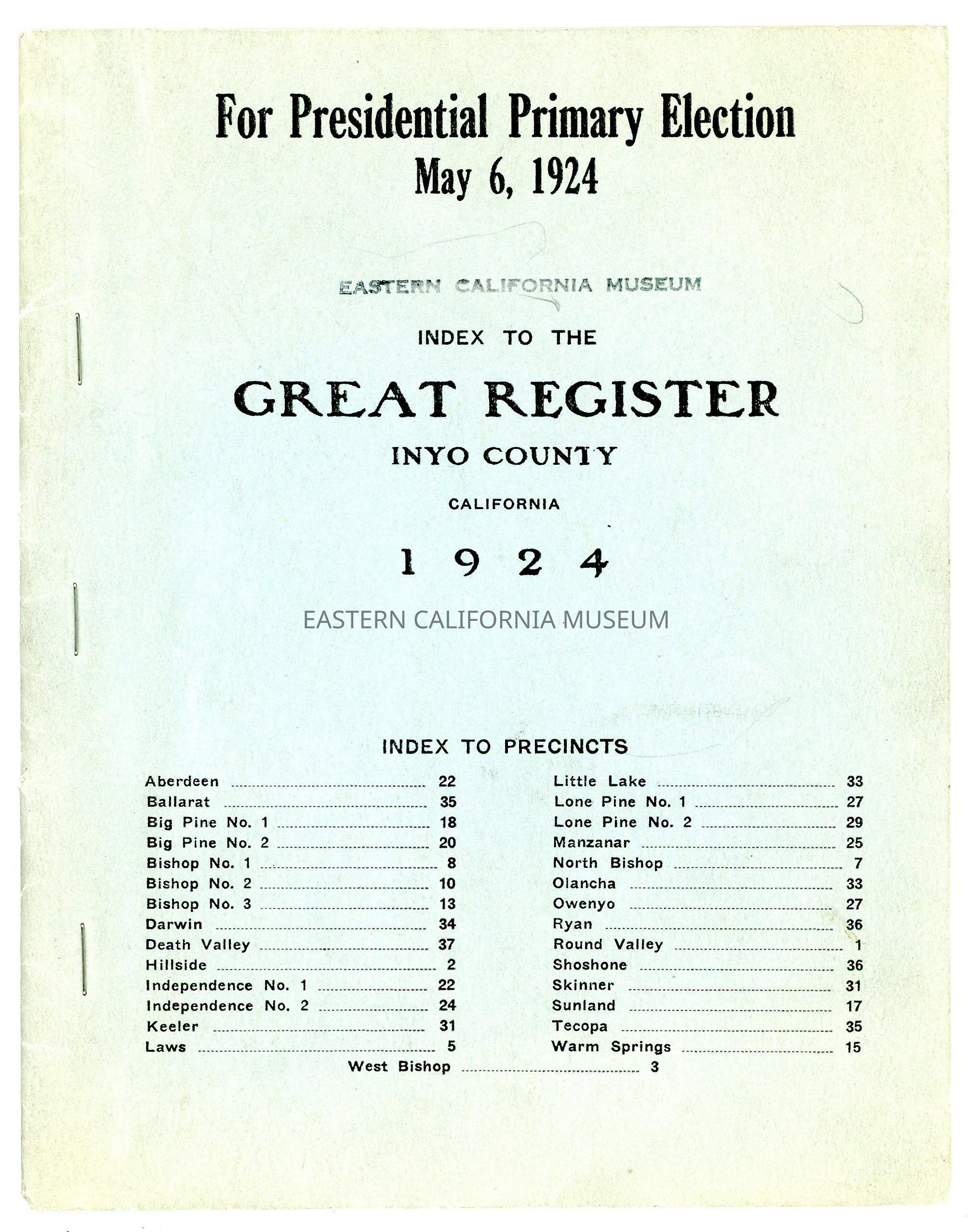 Index to the Great Register, Inyo County, California, Presidential Primary Election, May 6, 1924.Publication Details