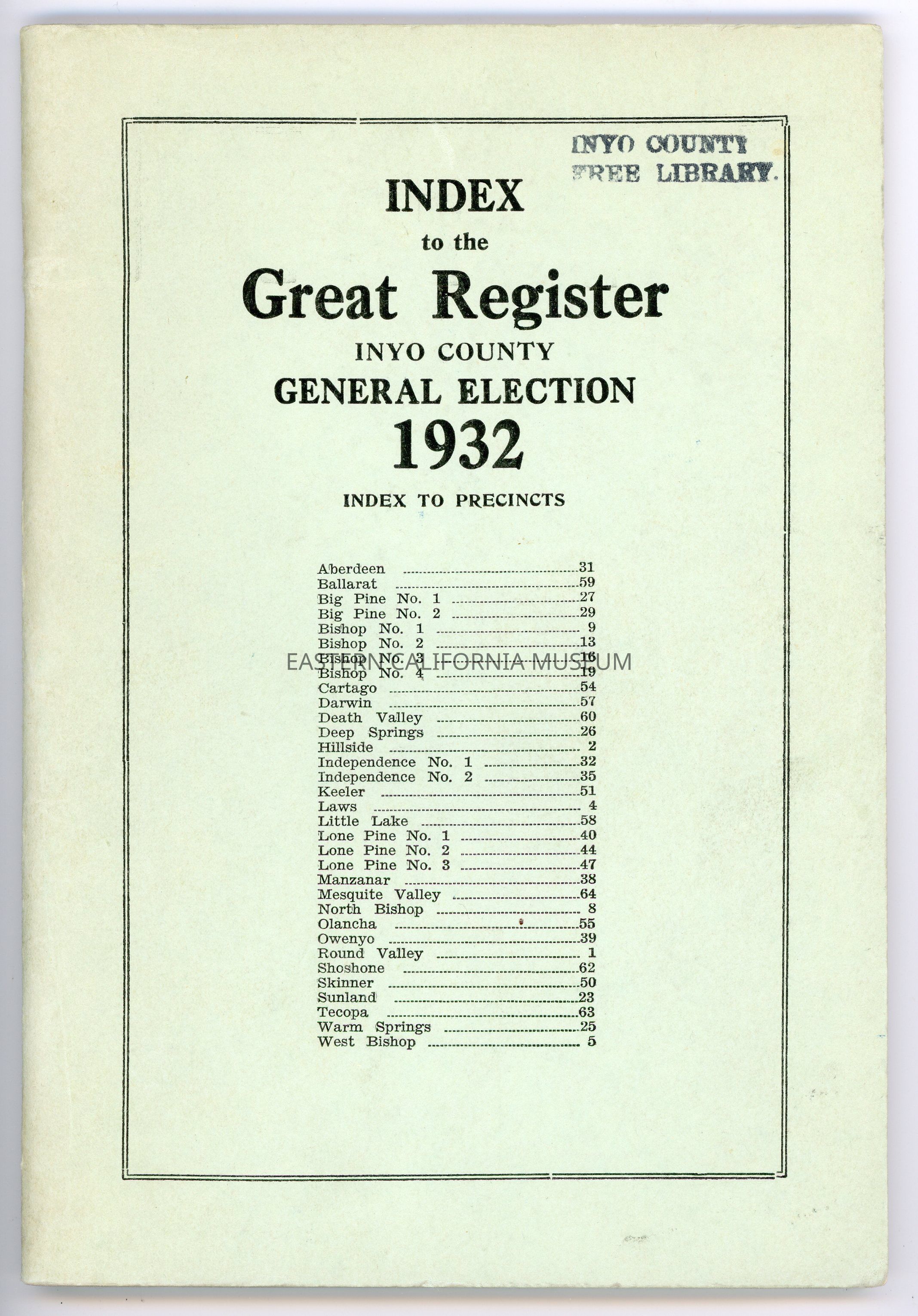 Index to the Great Register, Inyo County, General Election, 1932