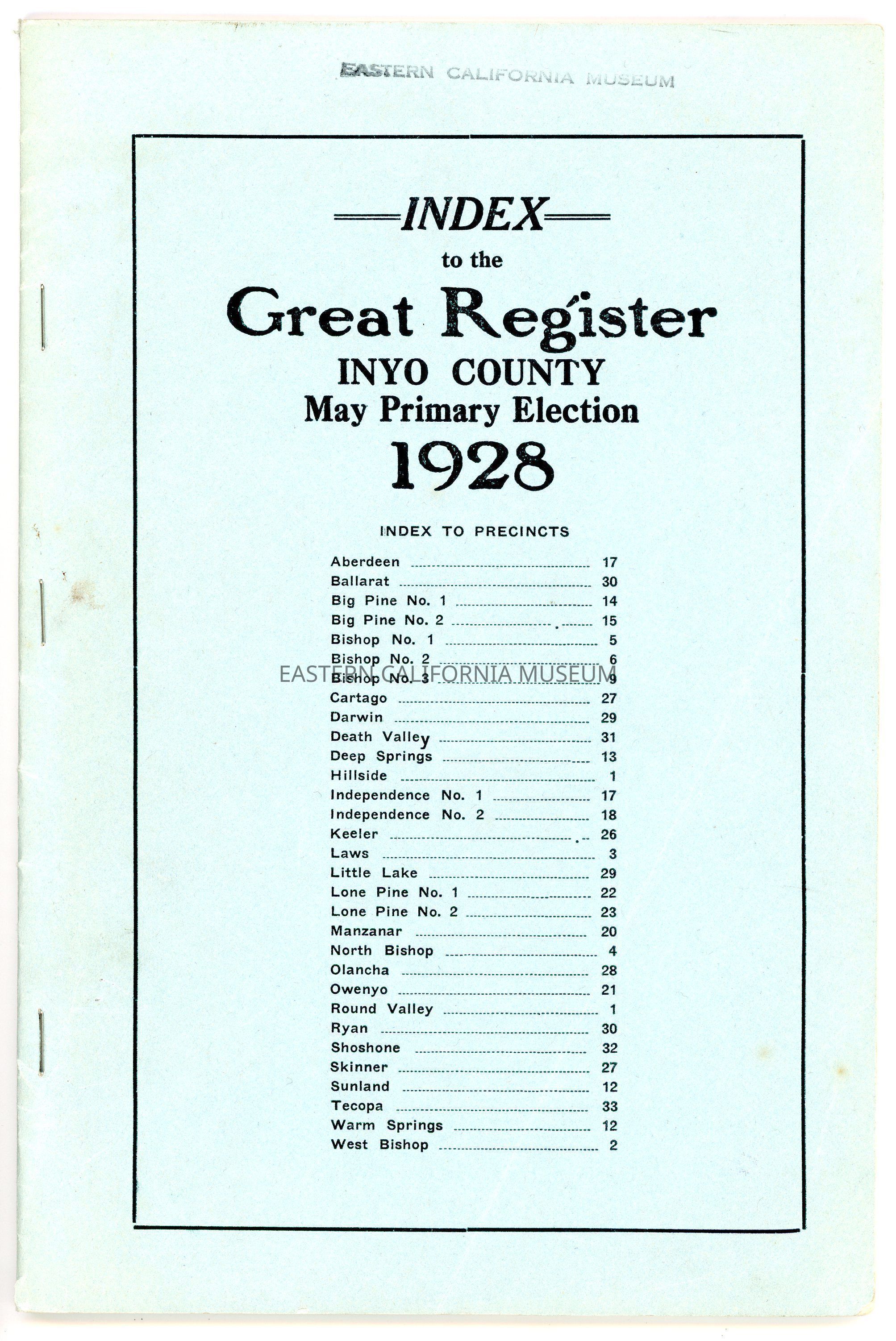 Index to the Great Register, Inyo County, Primary Election, May 1928.Publication Details