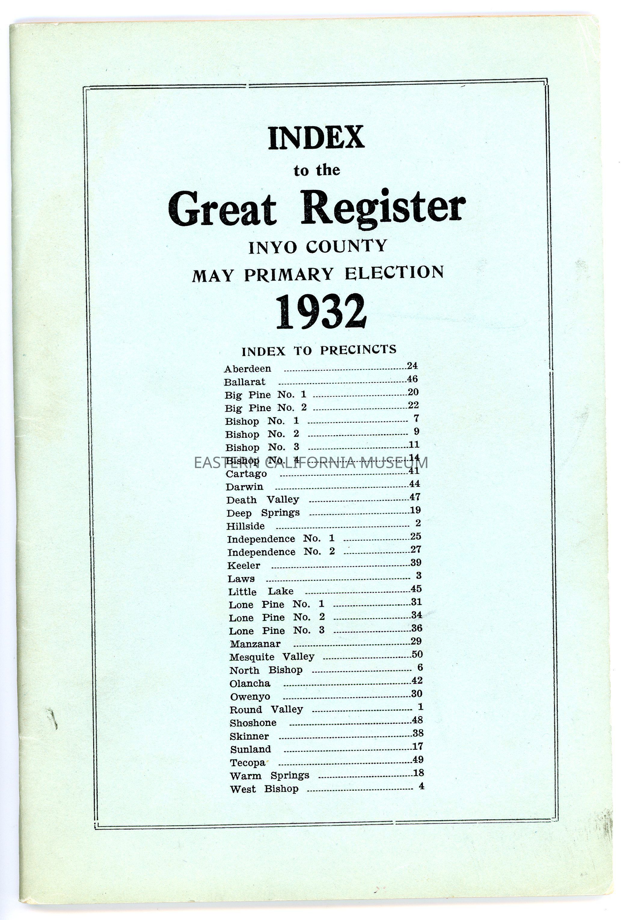Index to the Great Register, Inyo County, Primary Election, May 1932