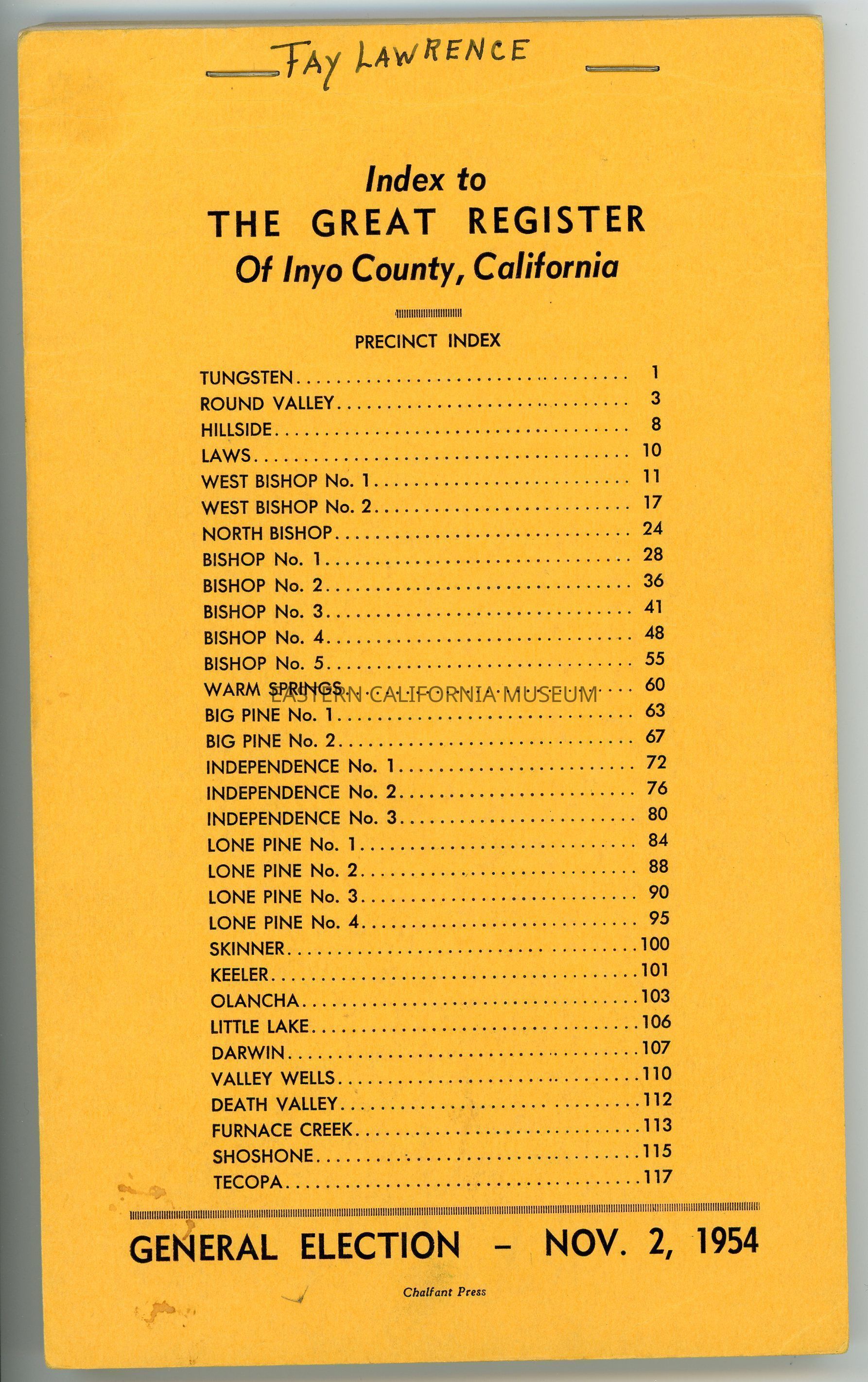 Index to the Great Register of Inyo County, California, General Election, November 2, 1954.