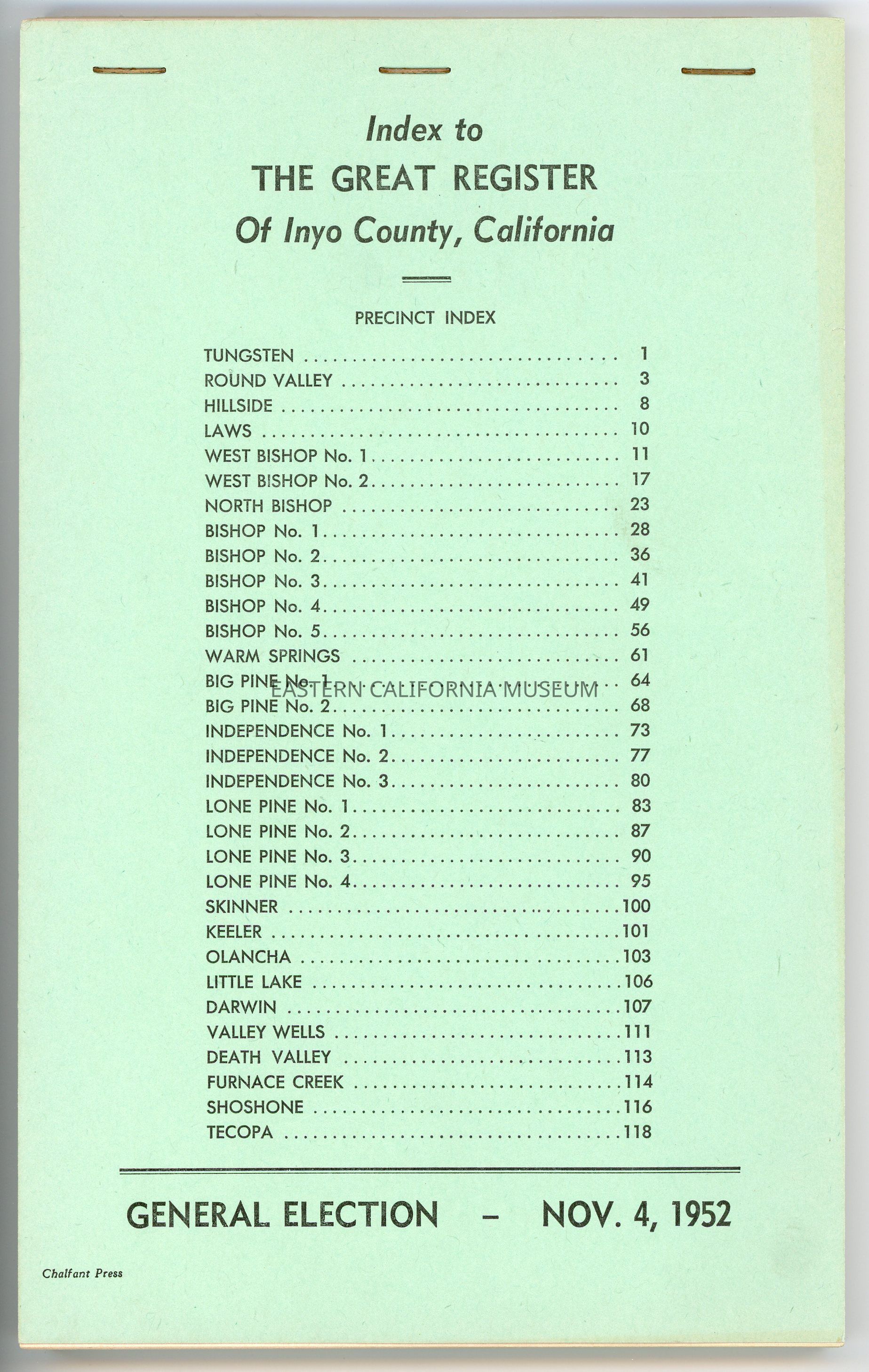 Index to the Great Register of Inyo County, California, General Election, November 4, 1952.Publication Details