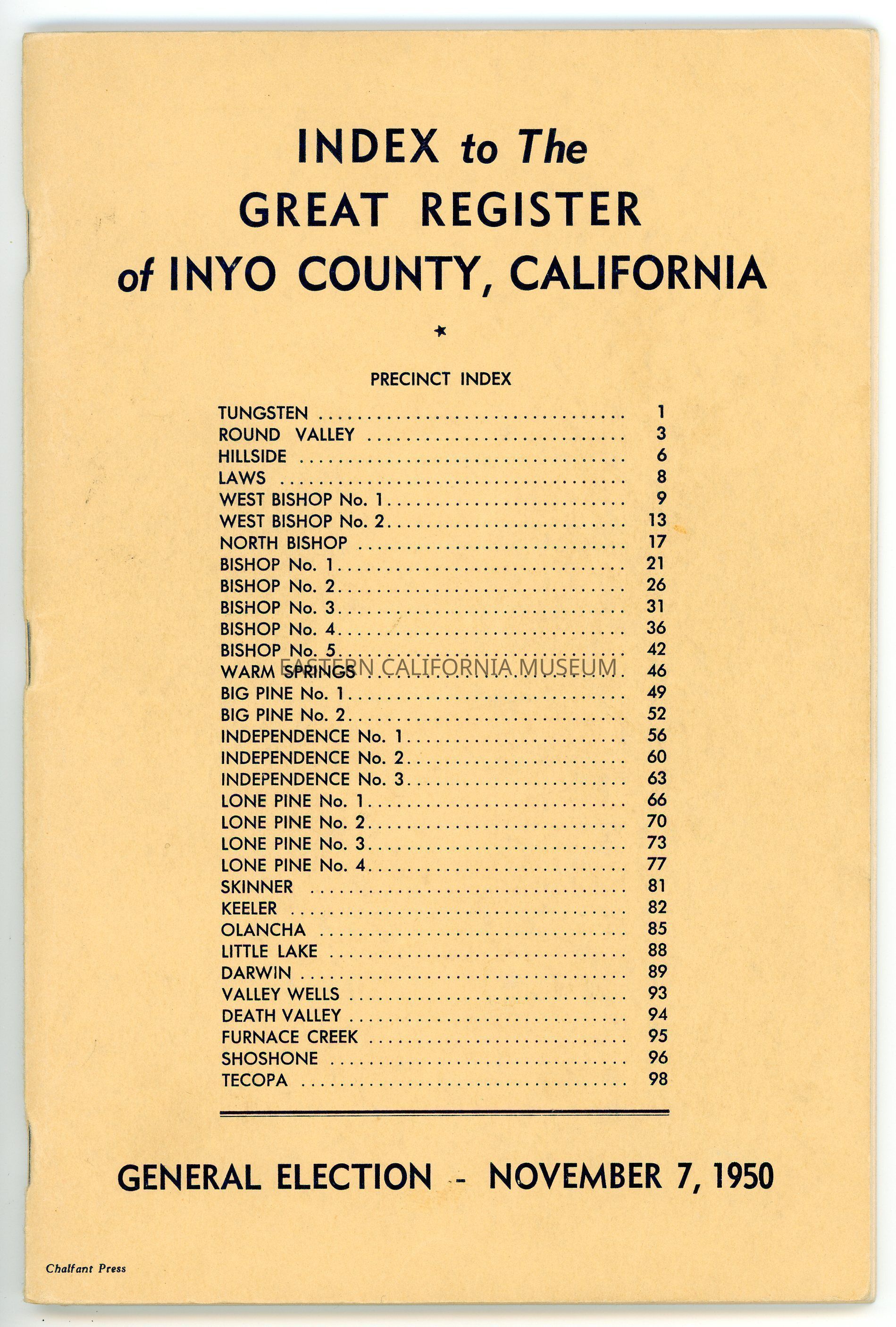 Index to the Great Register of Inyo County, California, General Election, November 7, 1950.Publication Details