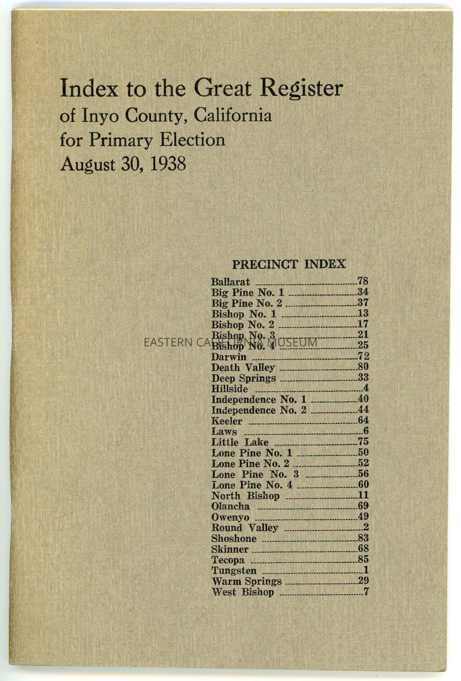 Index to the Great Register of Inyo County, California, Primary Election, August 30, 1938.Publication Details