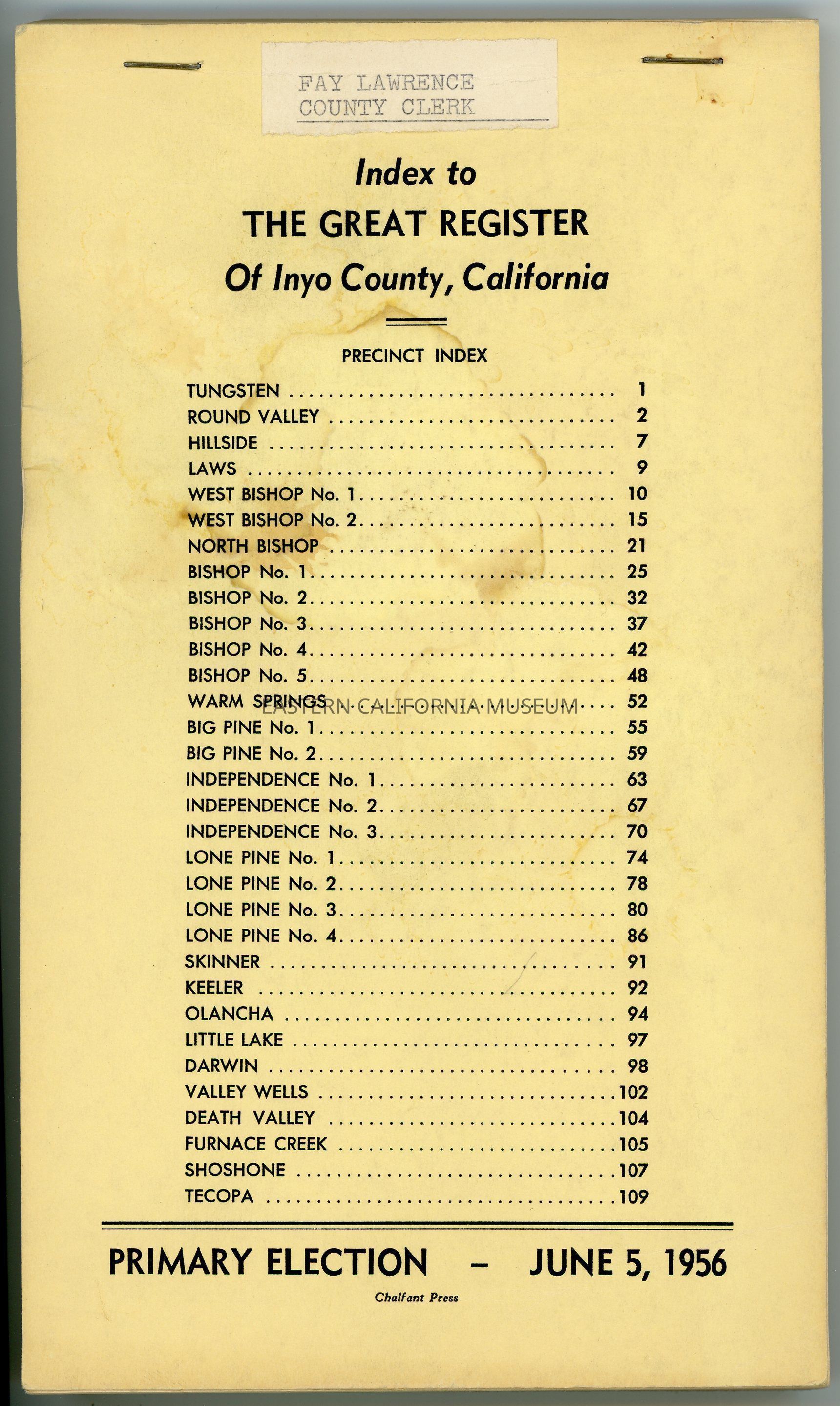 Index to the Great Register of Inyo County, California, Primary Election, June 5, 1956.